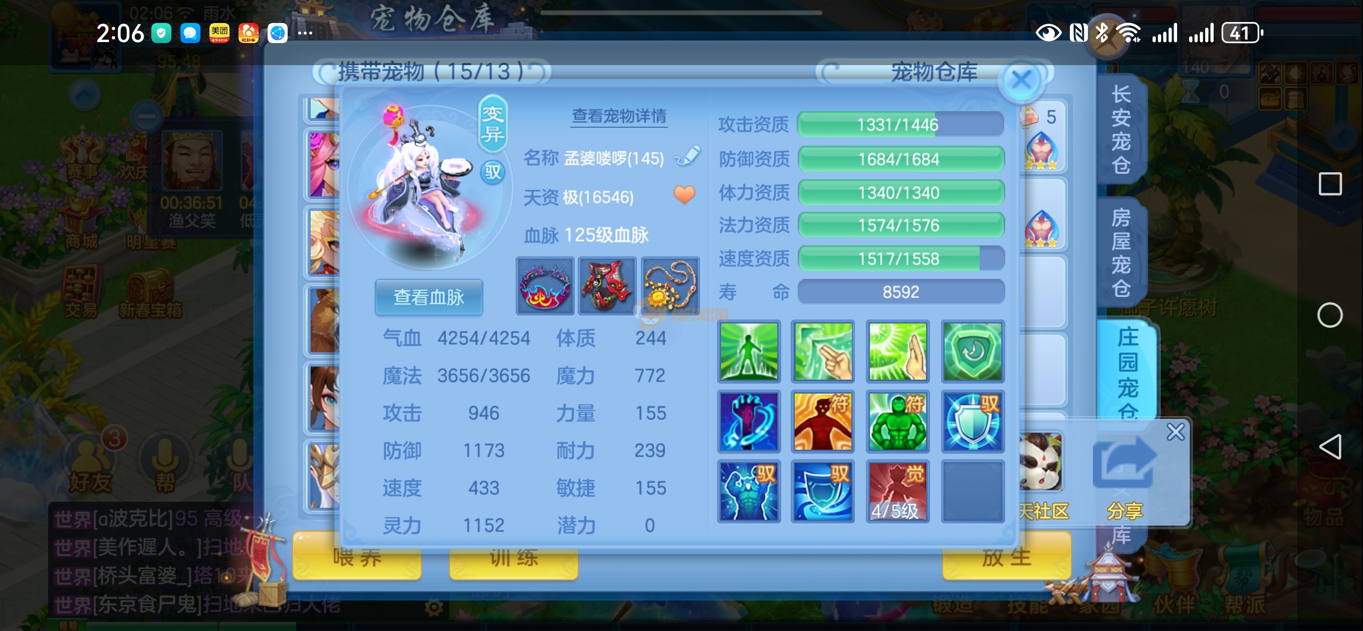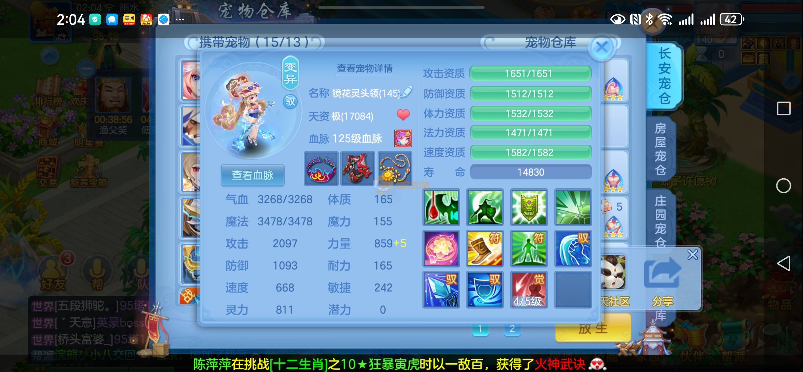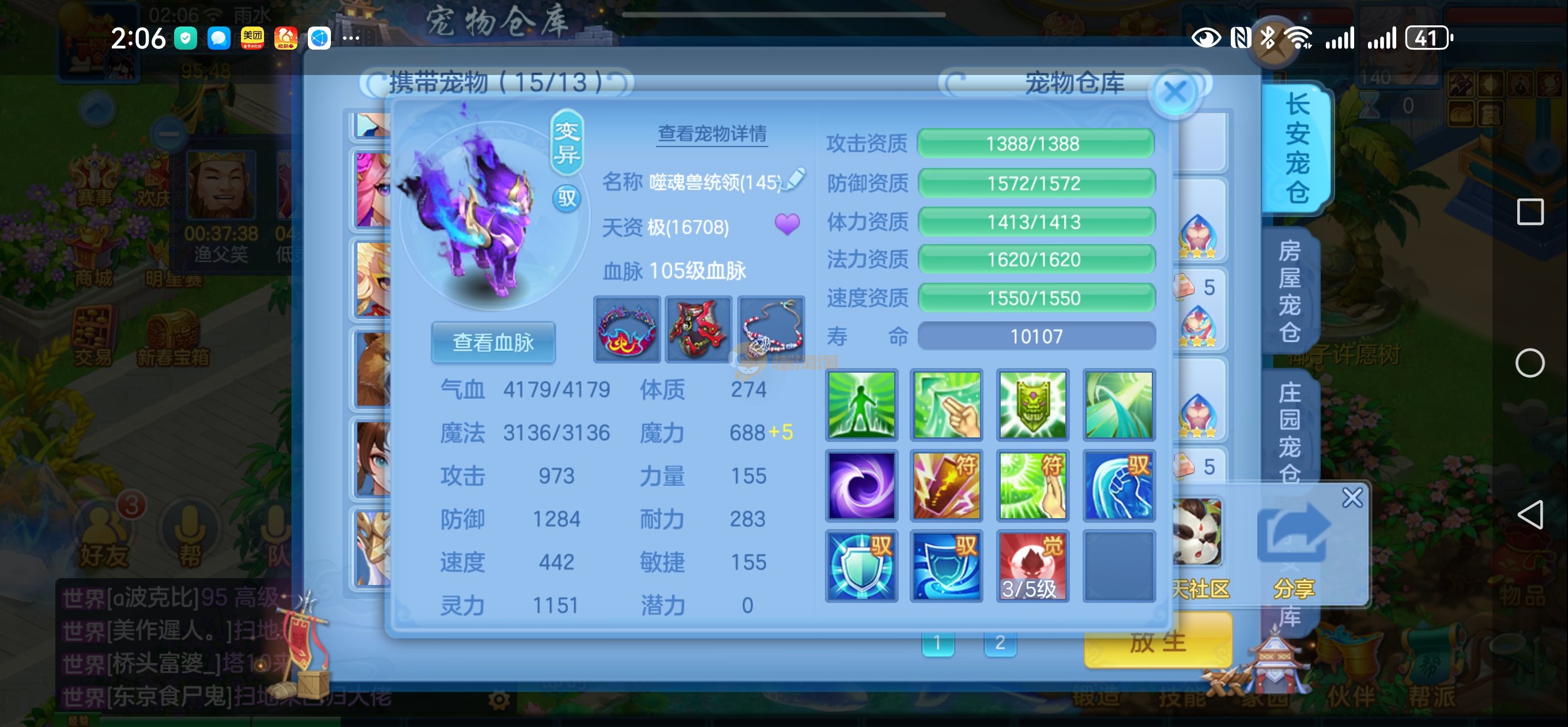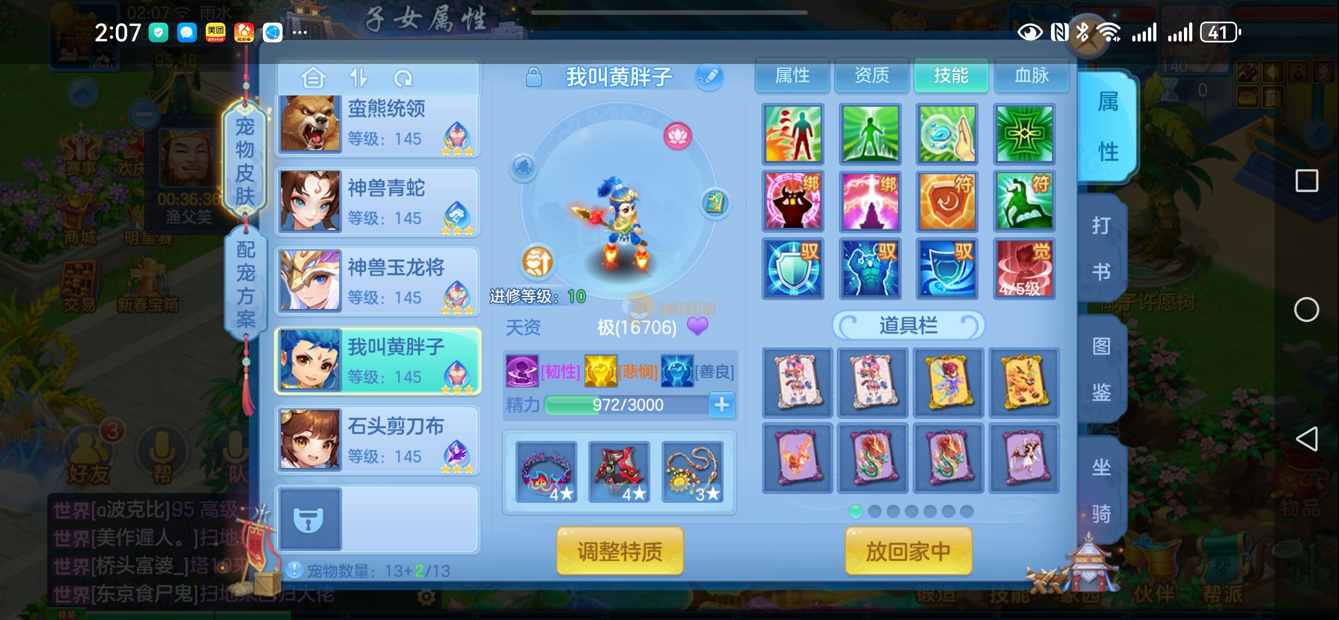 强化仙一龙两蛇一马。特技齐全,宝宝皮肤全,10个满兽魂,辅助特技妙手。13段混12,还有145万银,1884金,坐骑衣橱全,单身海景房,资源满满