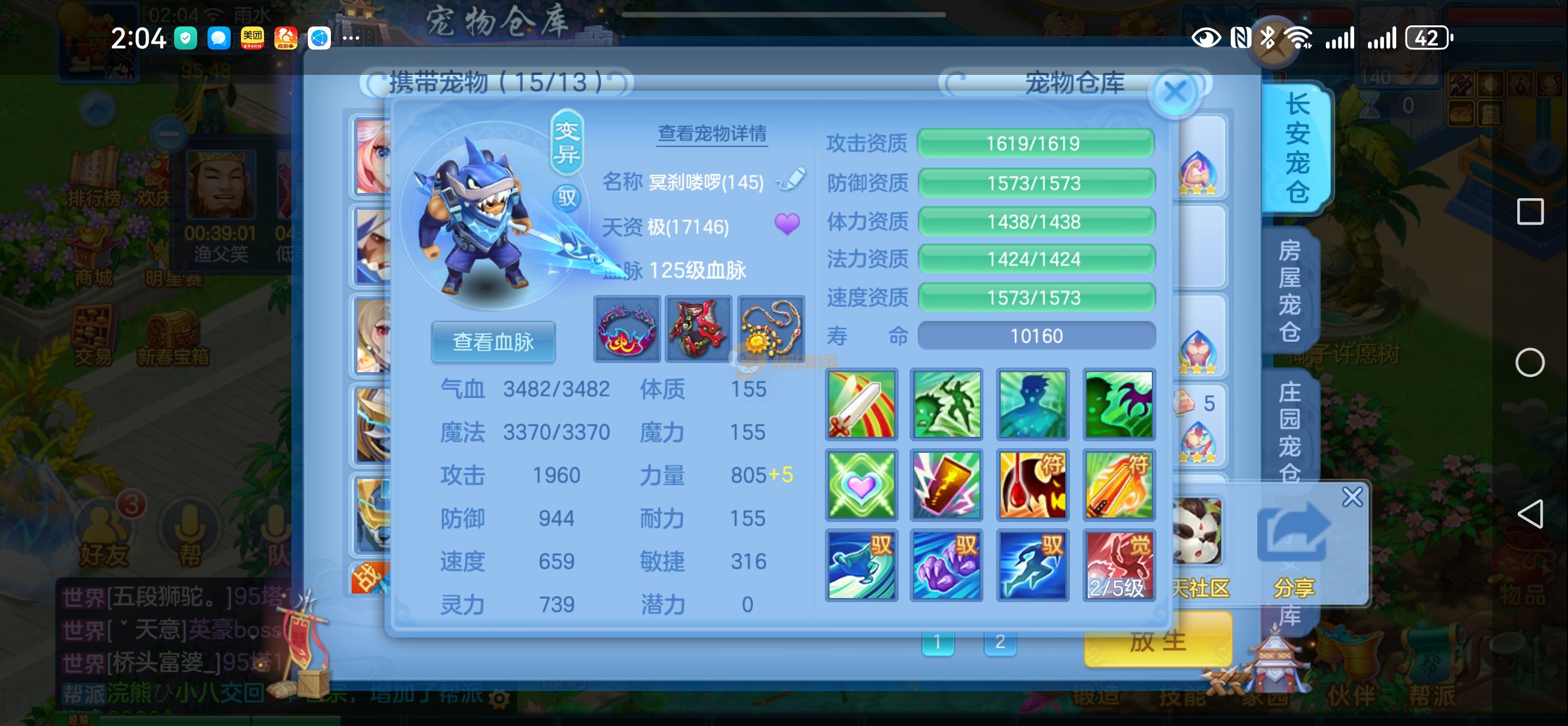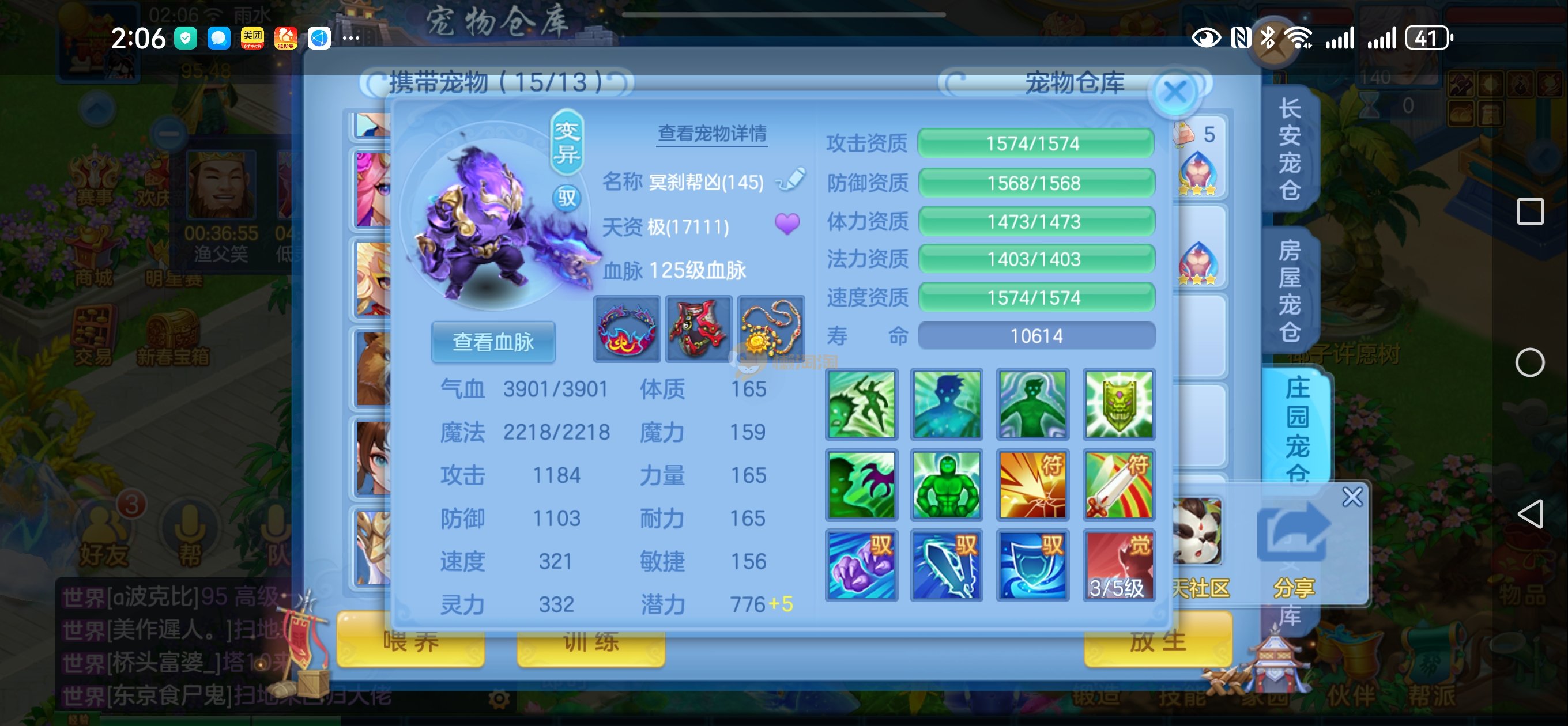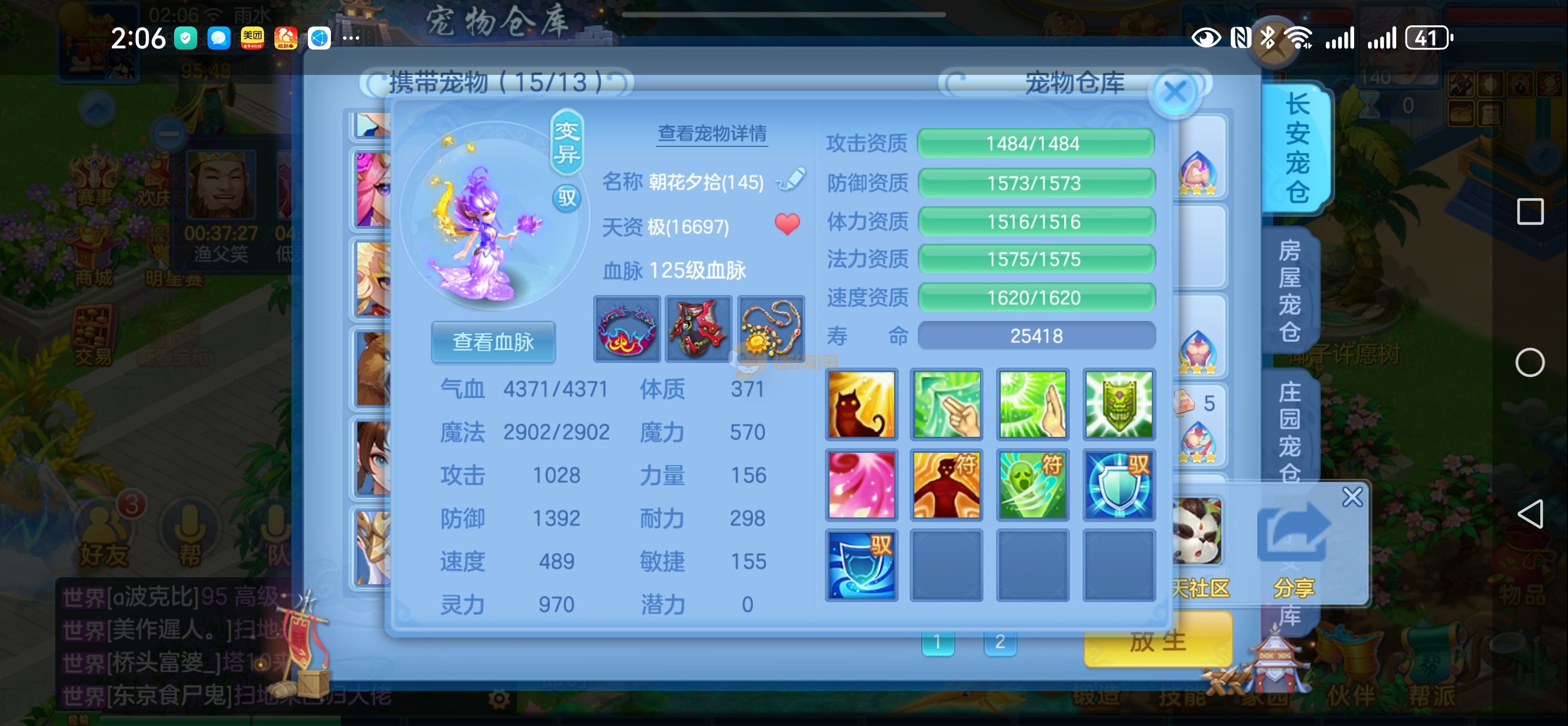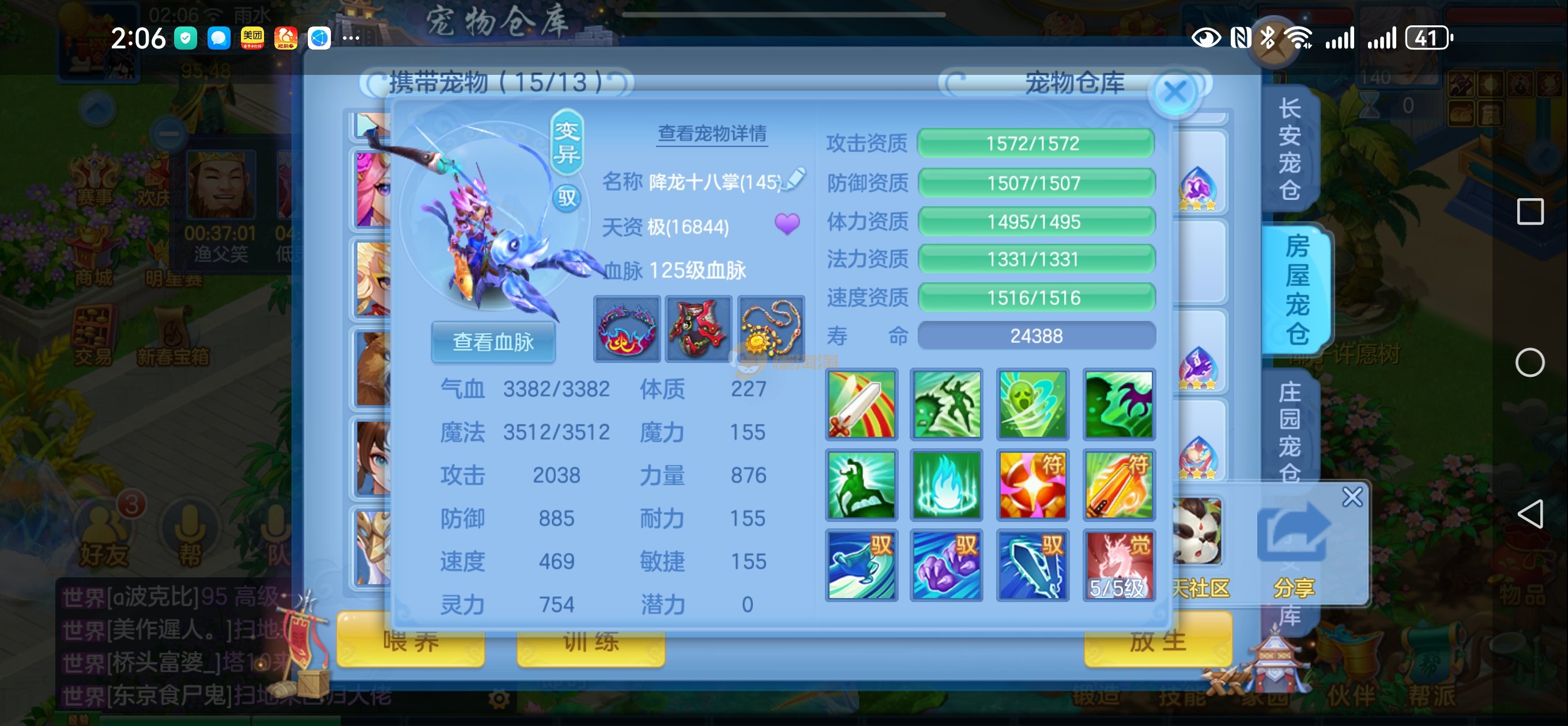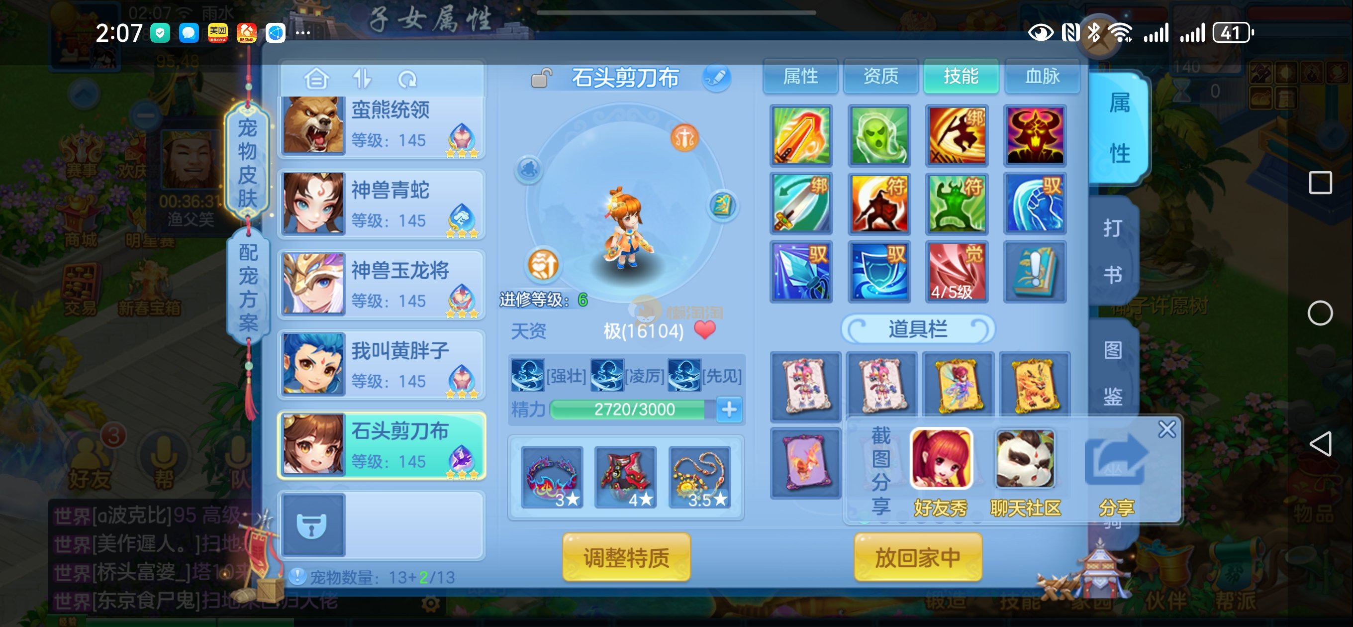强化仙一龙两蛇一马。特技齐全,宝宝皮肤全,10个满兽魂,辅助特技妙手。13段混12,还有145万银,1884金,坐骑衣橱全,单身海景房,资源满满