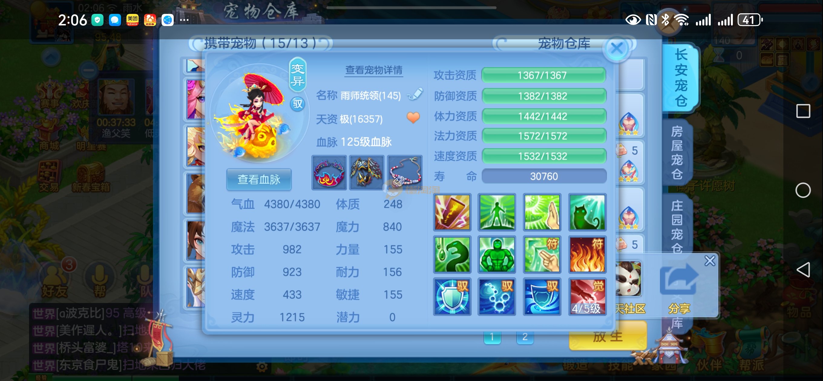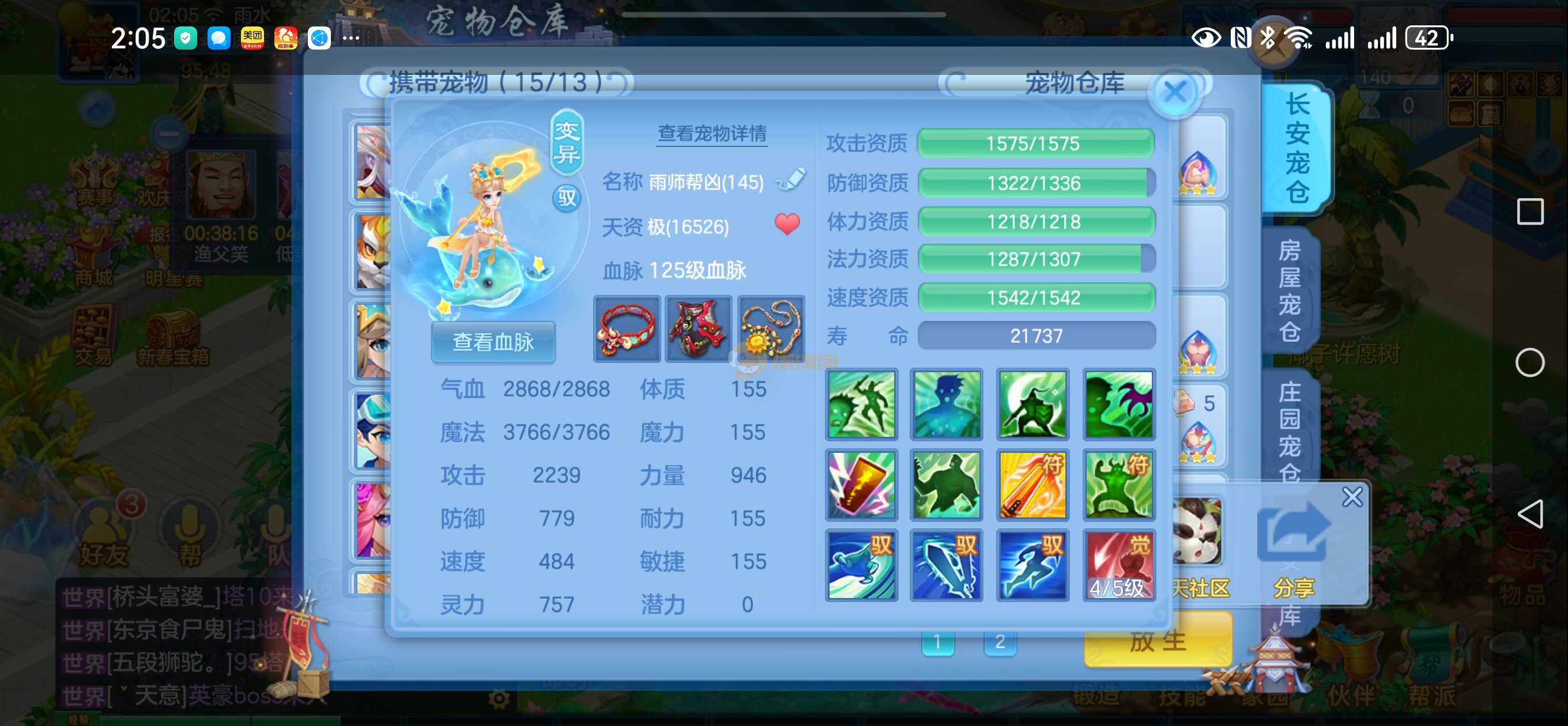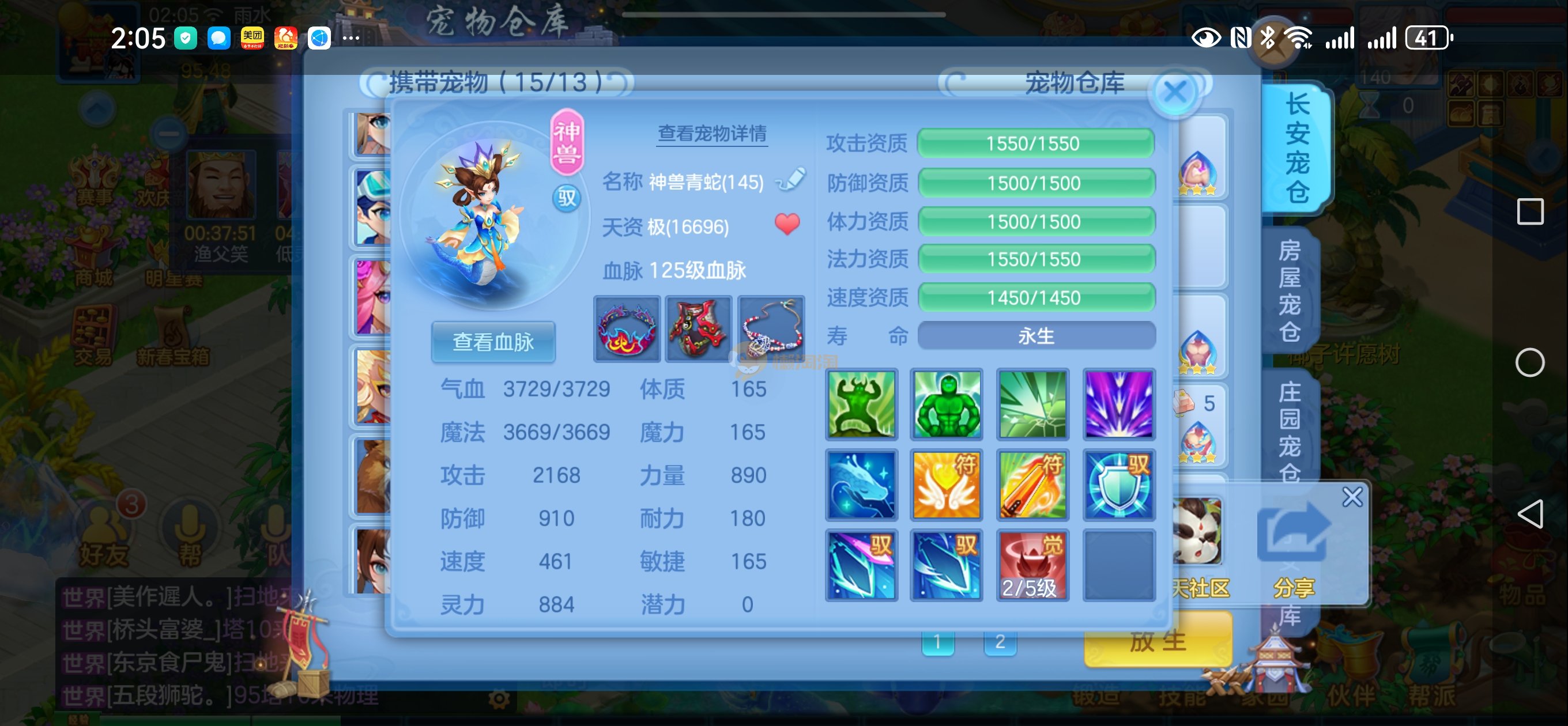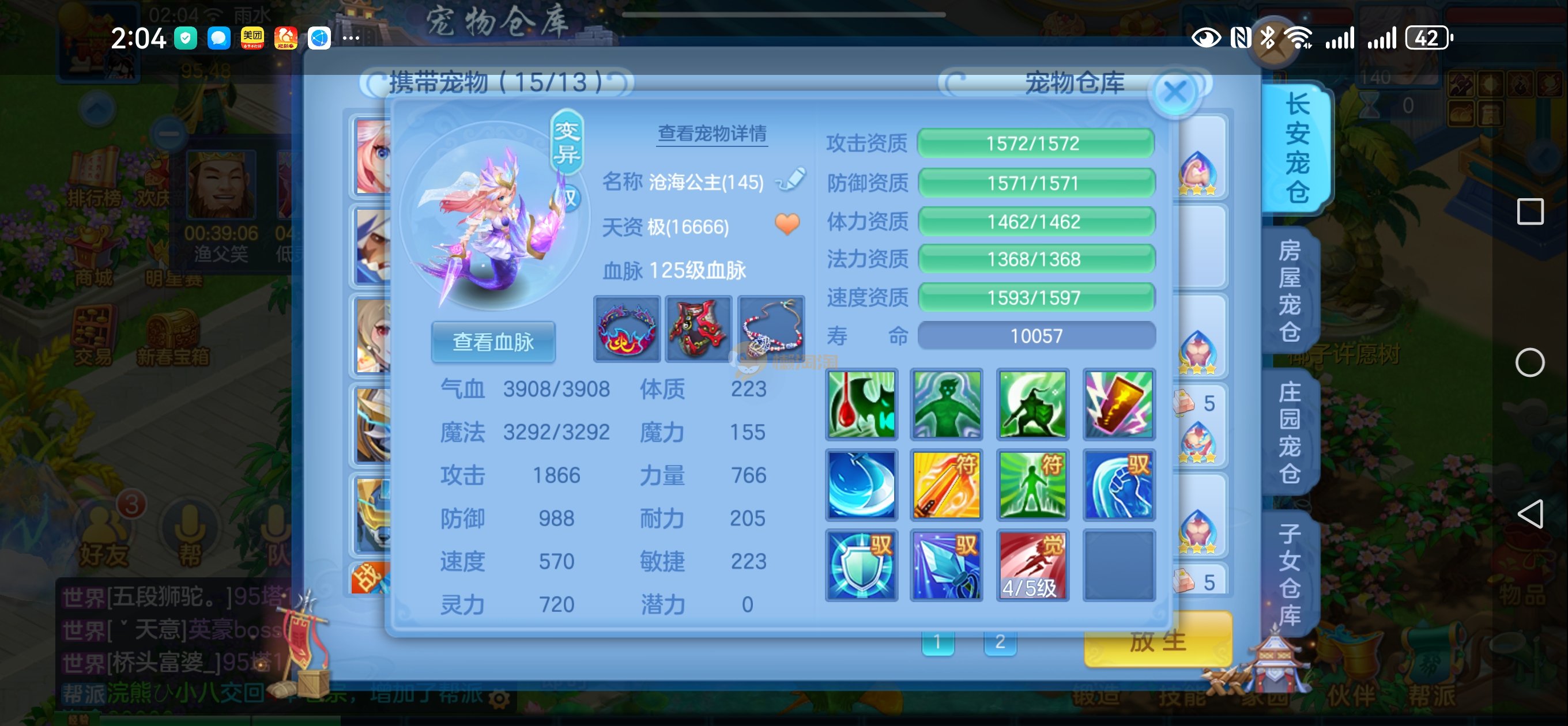 强化仙一龙两蛇一马。特技齐全,宝宝皮肤全,10个满兽魂,辅助特技妙手。13段混12,还有145万银,1884金,坐骑衣橱全,单身海景房,资源满满