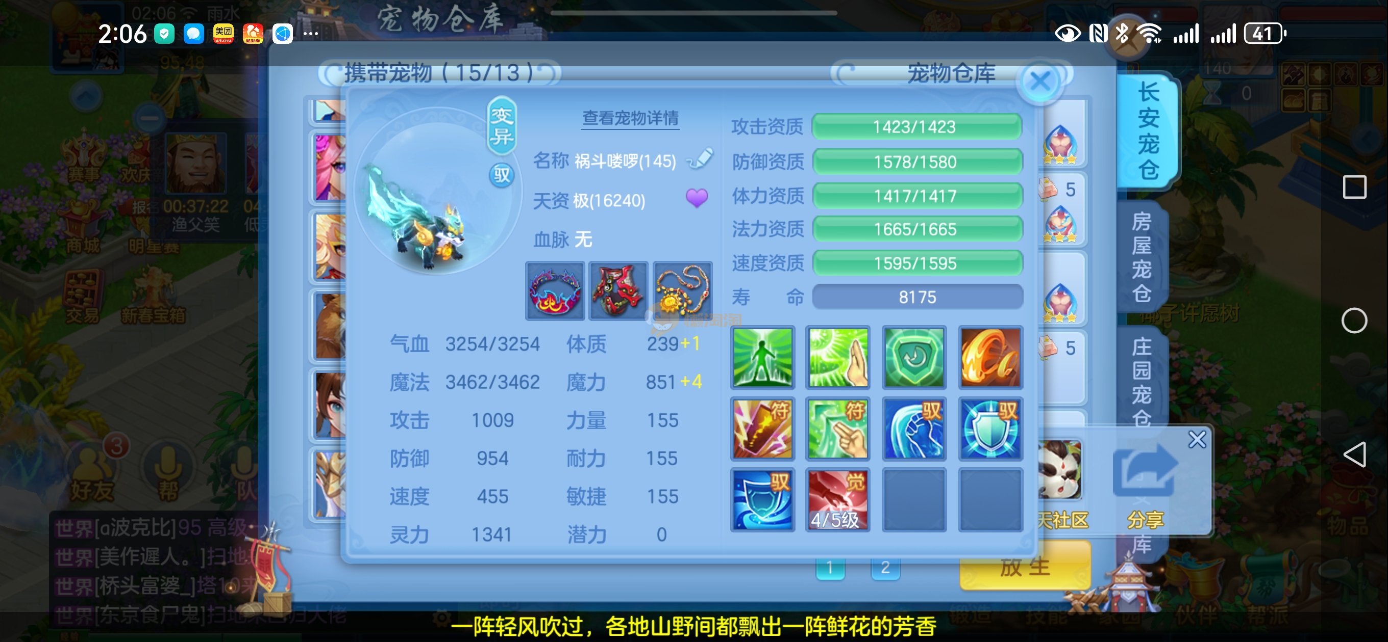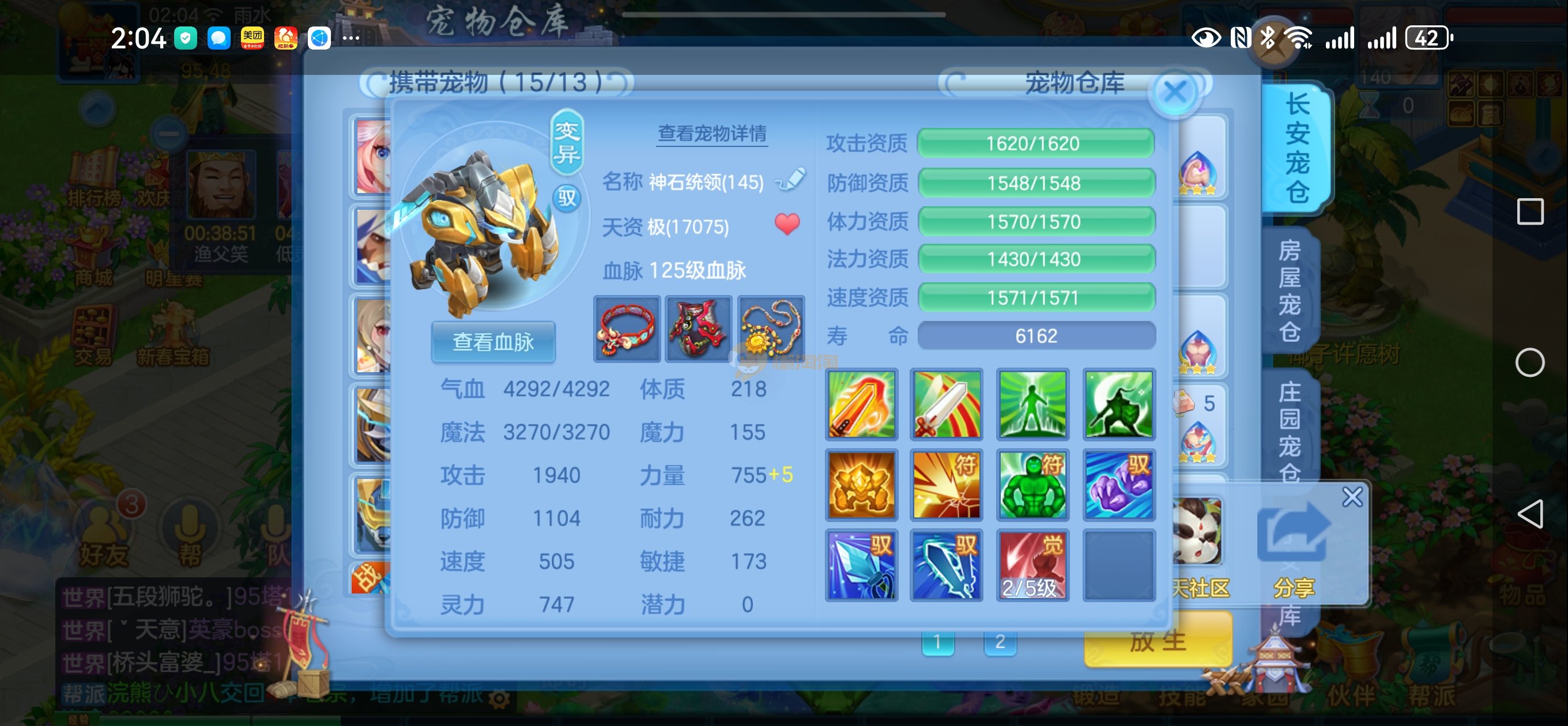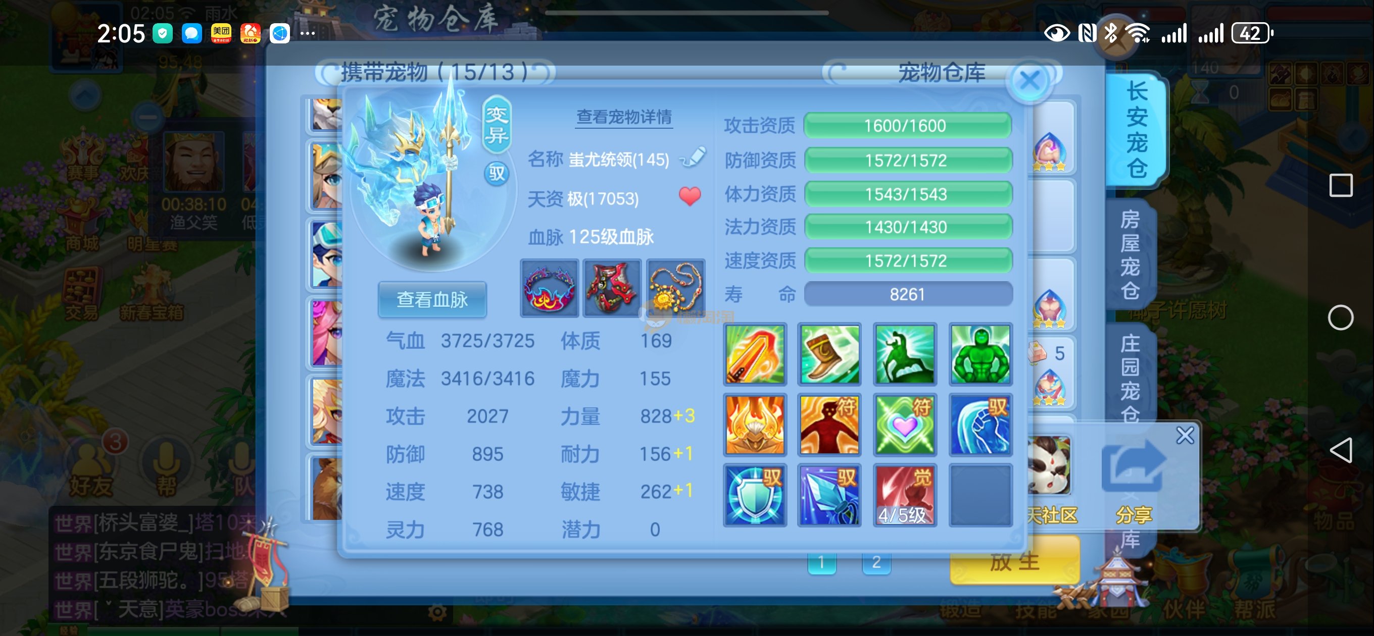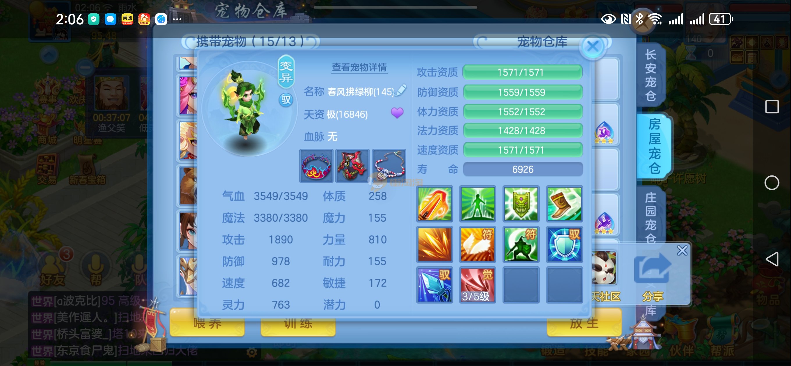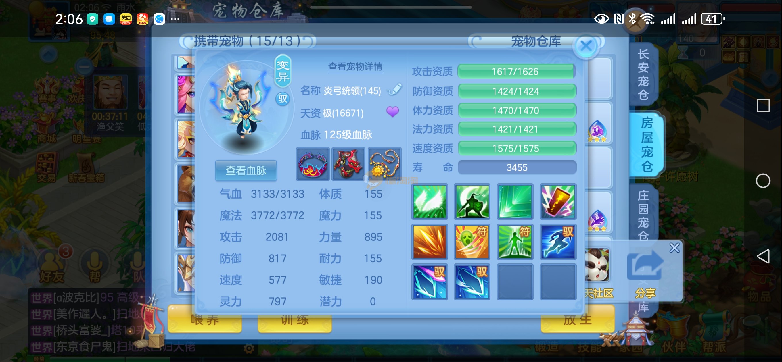 强化仙一龙两蛇一马。特技齐全,宝宝皮肤全,10个满兽魂,辅助特技妙手。13段混12,还有145万银,1884金,坐骑衣橱全,单身海景房,资源满满