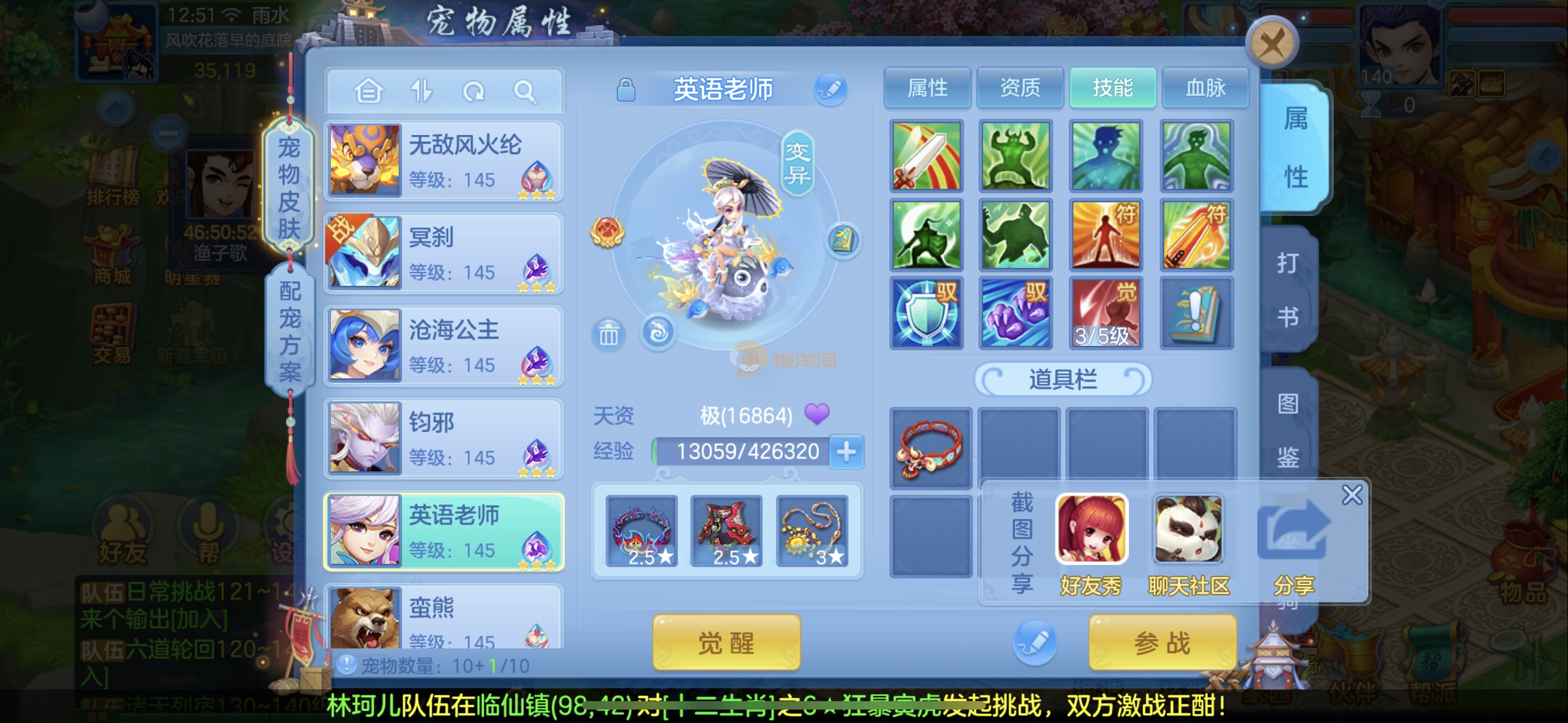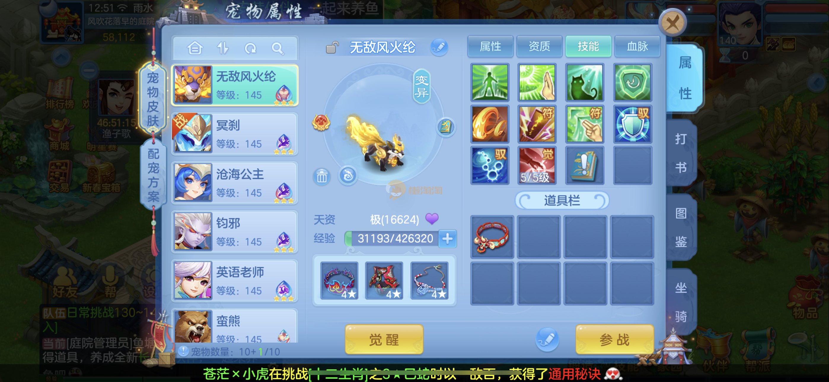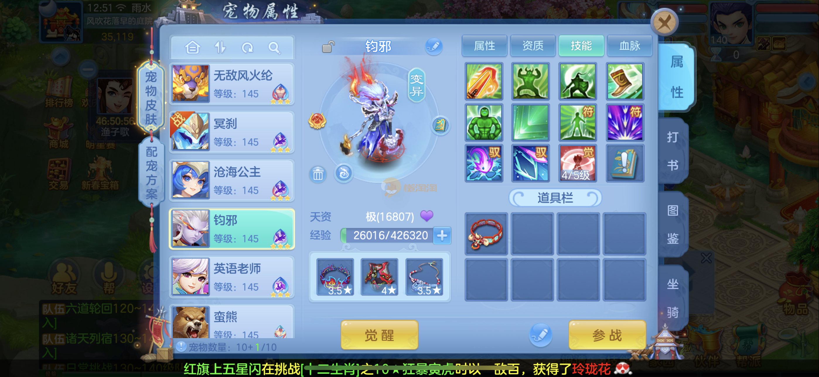强化仙一龙两蛇一马。特技齐全,宝宝皮肤全,10个满兽魂,辅助特技妙手。13段混12,还有145万银,1884金,坐骑衣橱全,单身海景房,资源满满