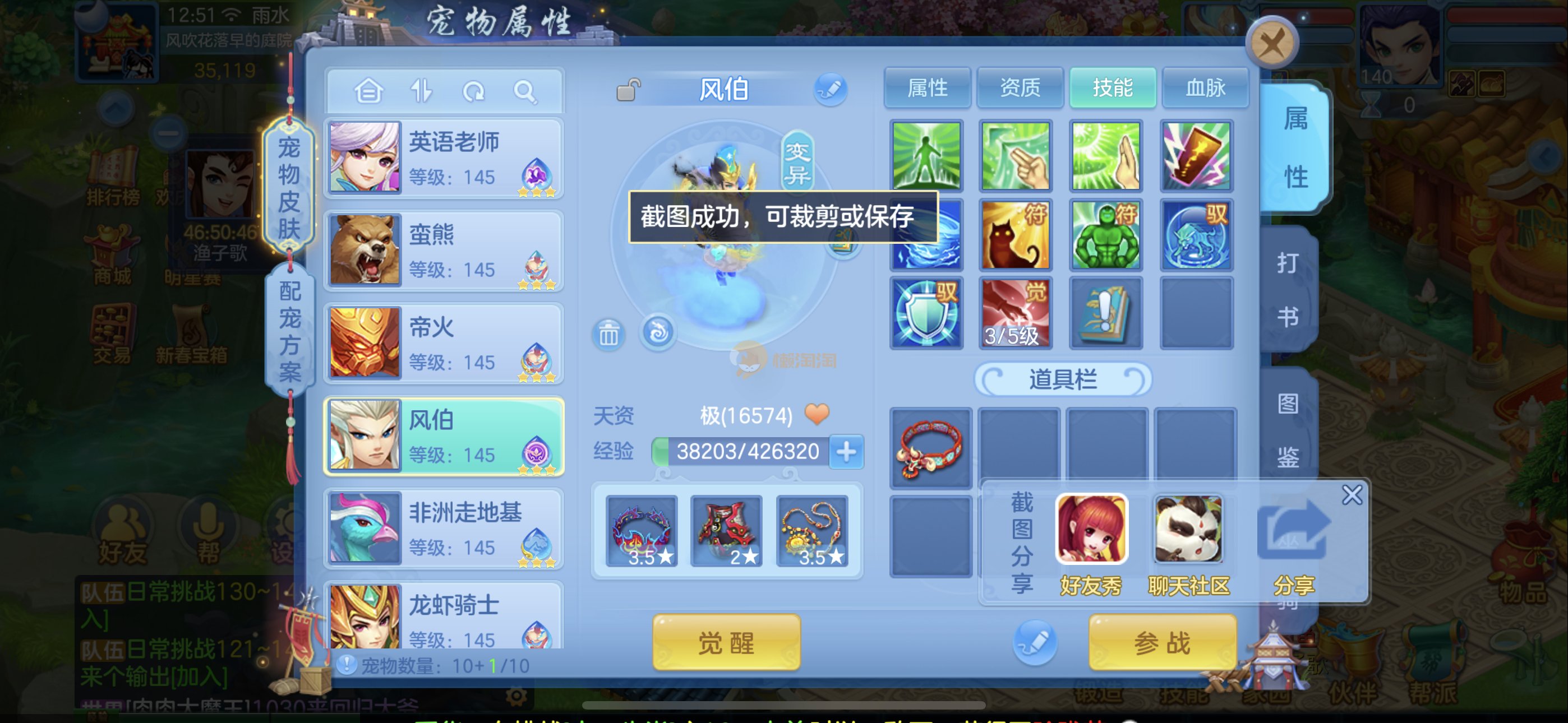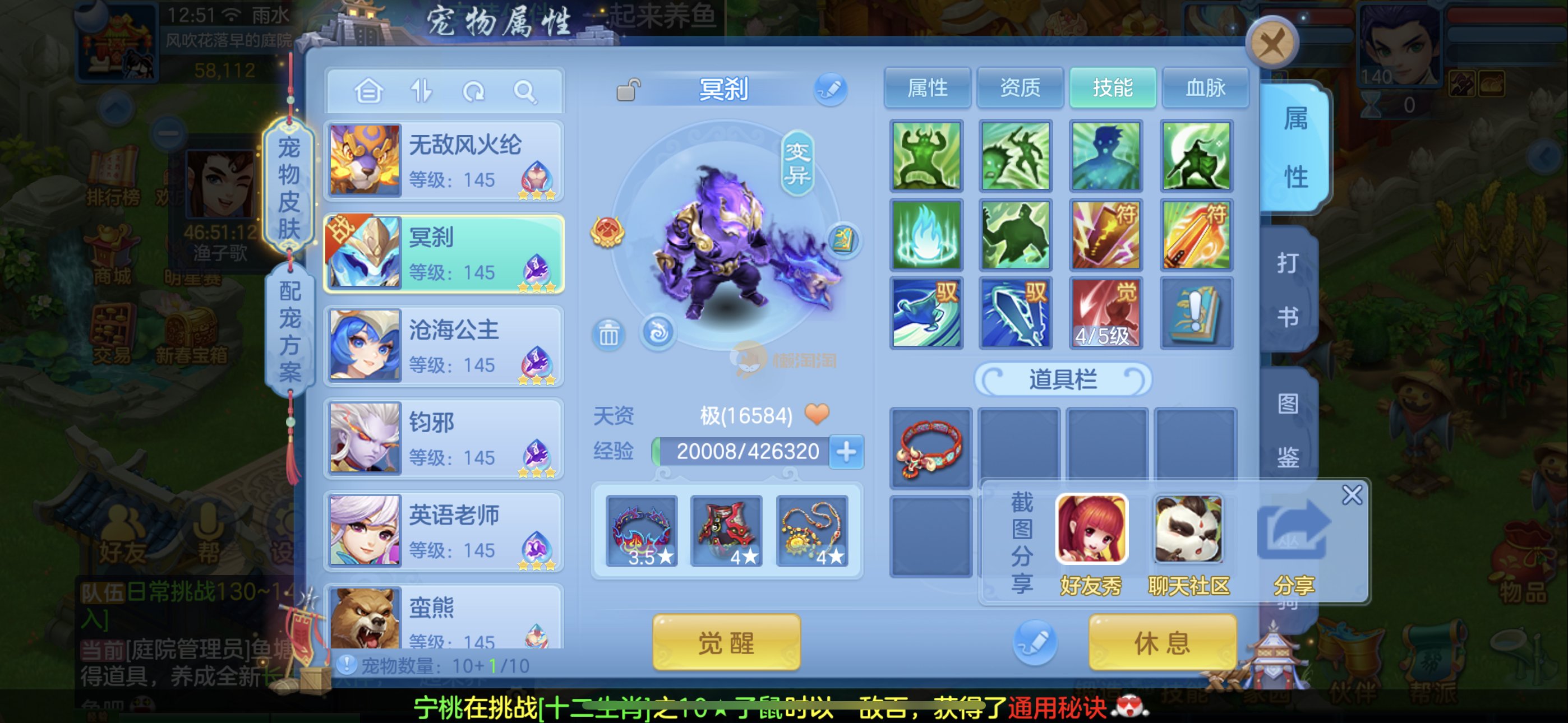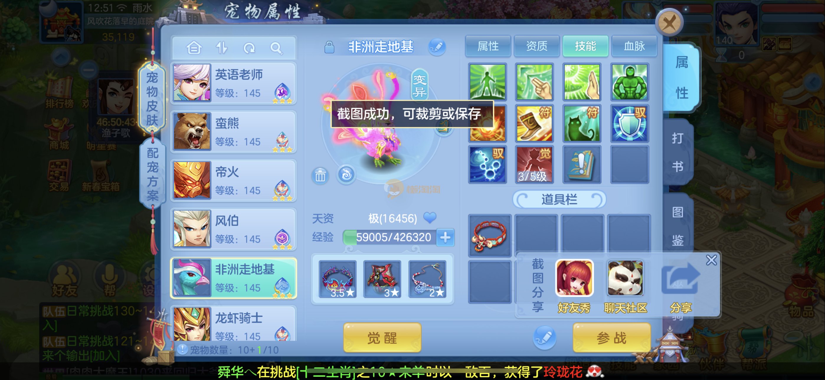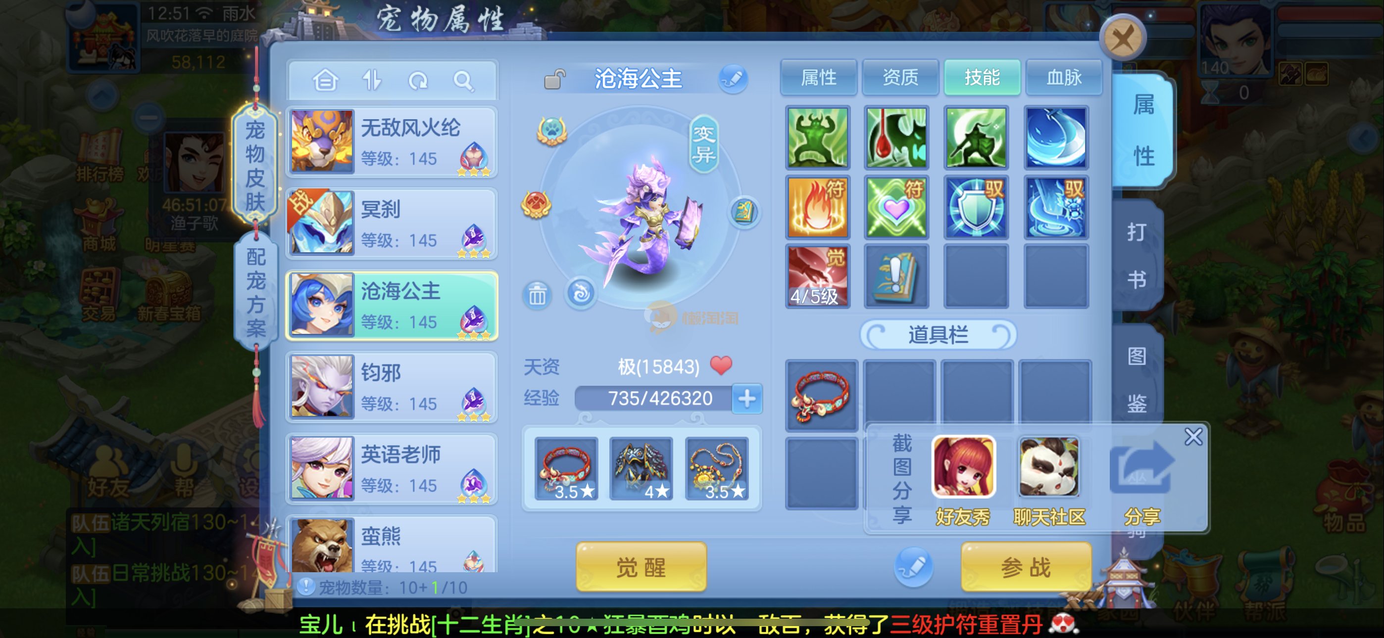 强化仙一龙两蛇一马。特技齐全,宝宝皮肤全,10个满兽魂,辅助特技妙手。13段混12,还有145万银,1884金,坐骑衣橱全,单身海景房,资源满满