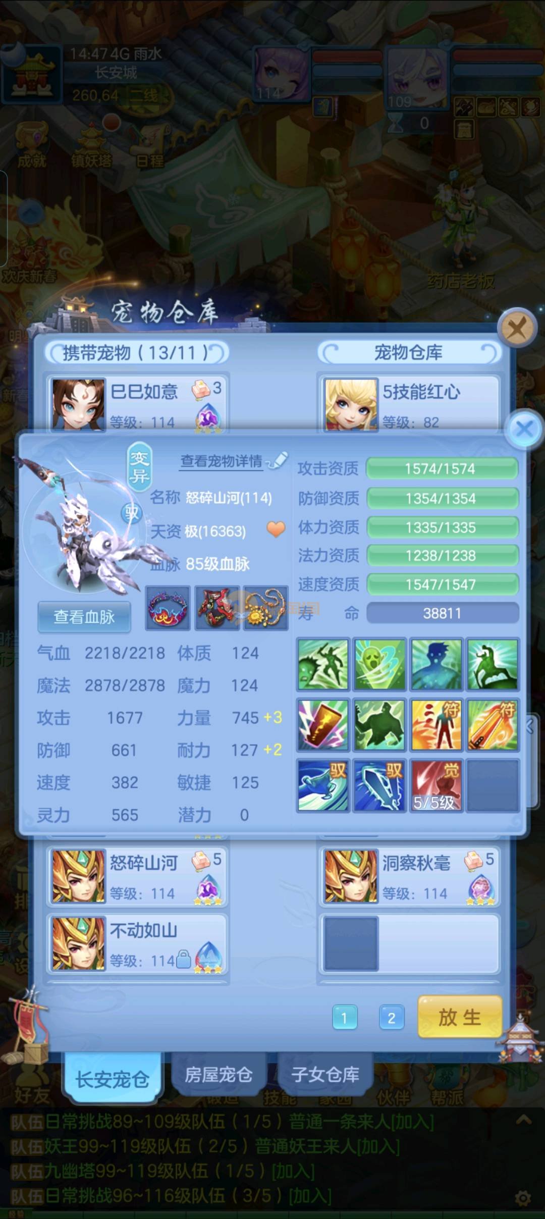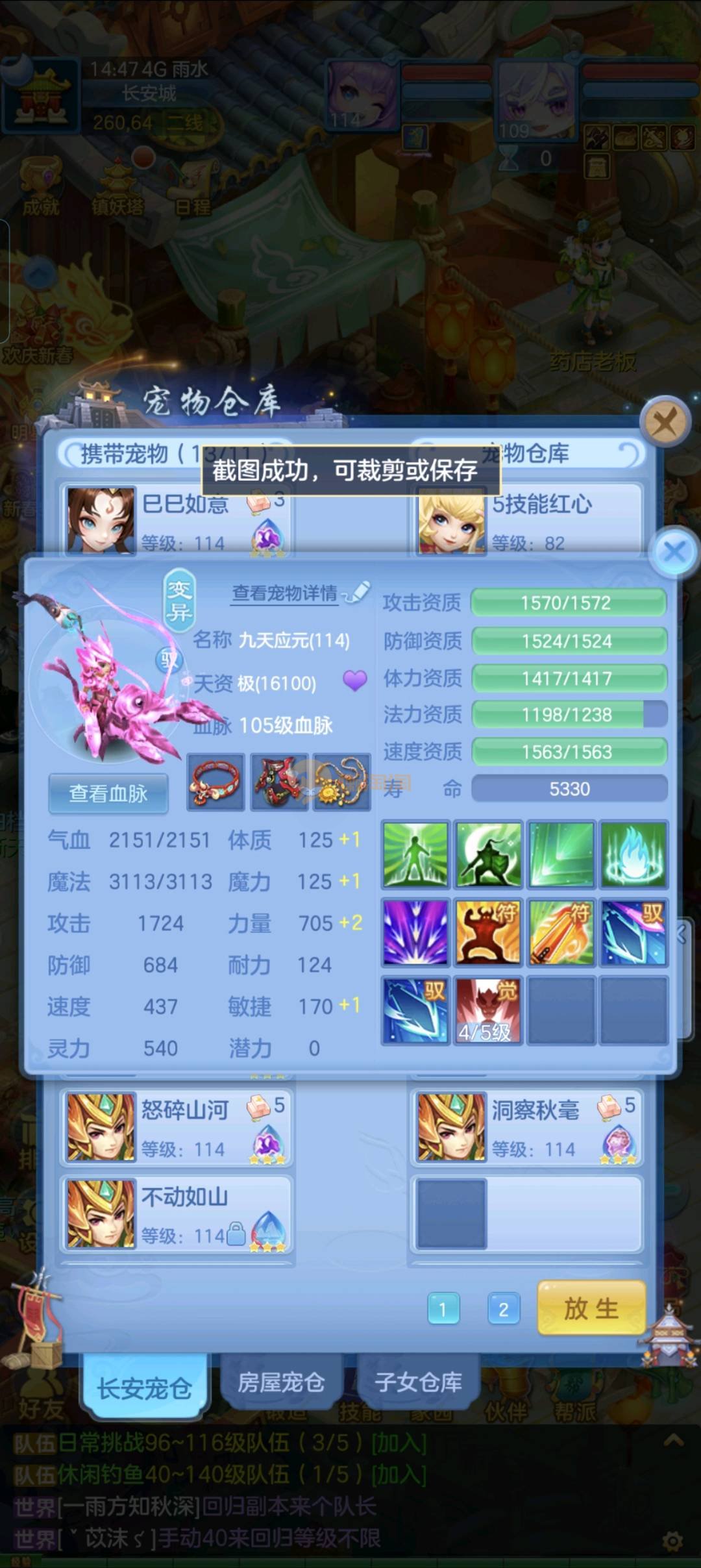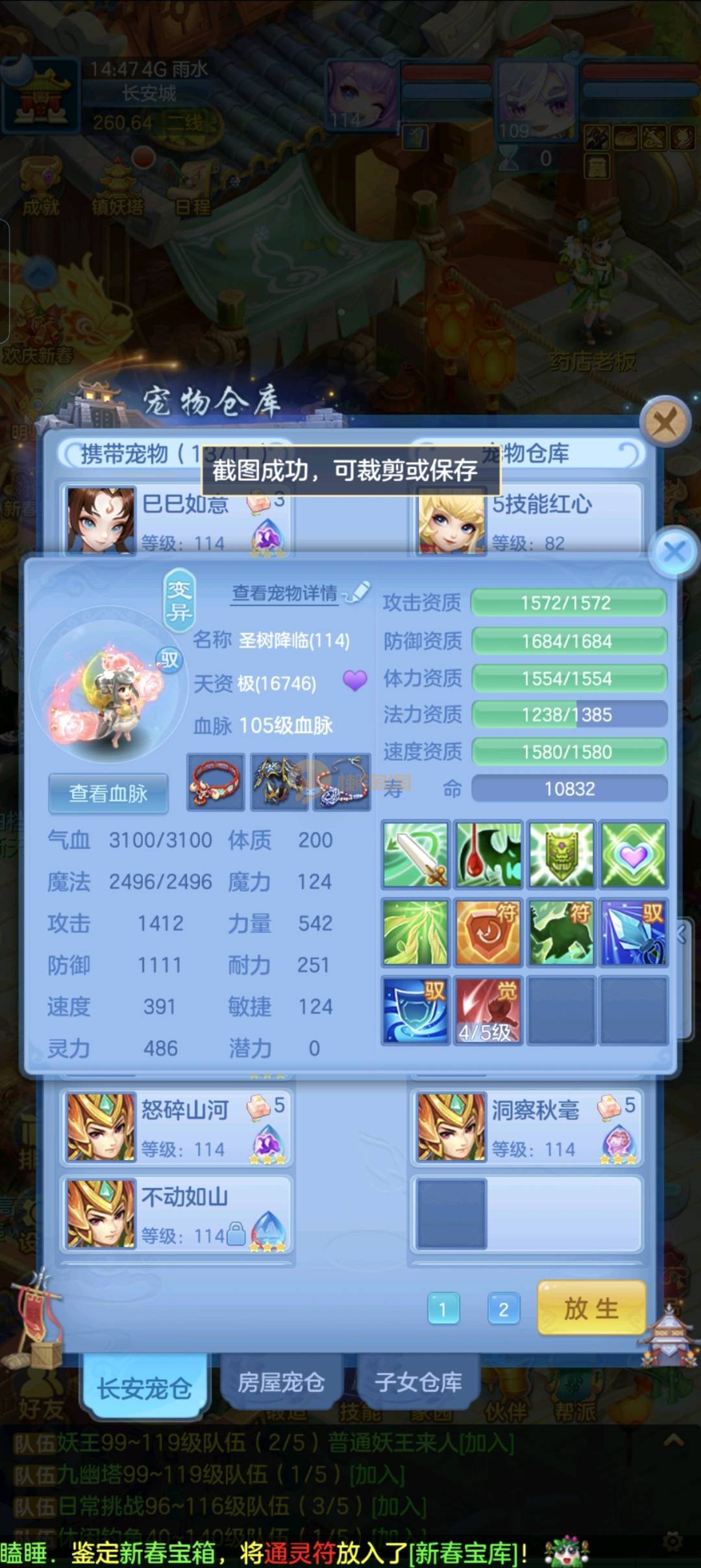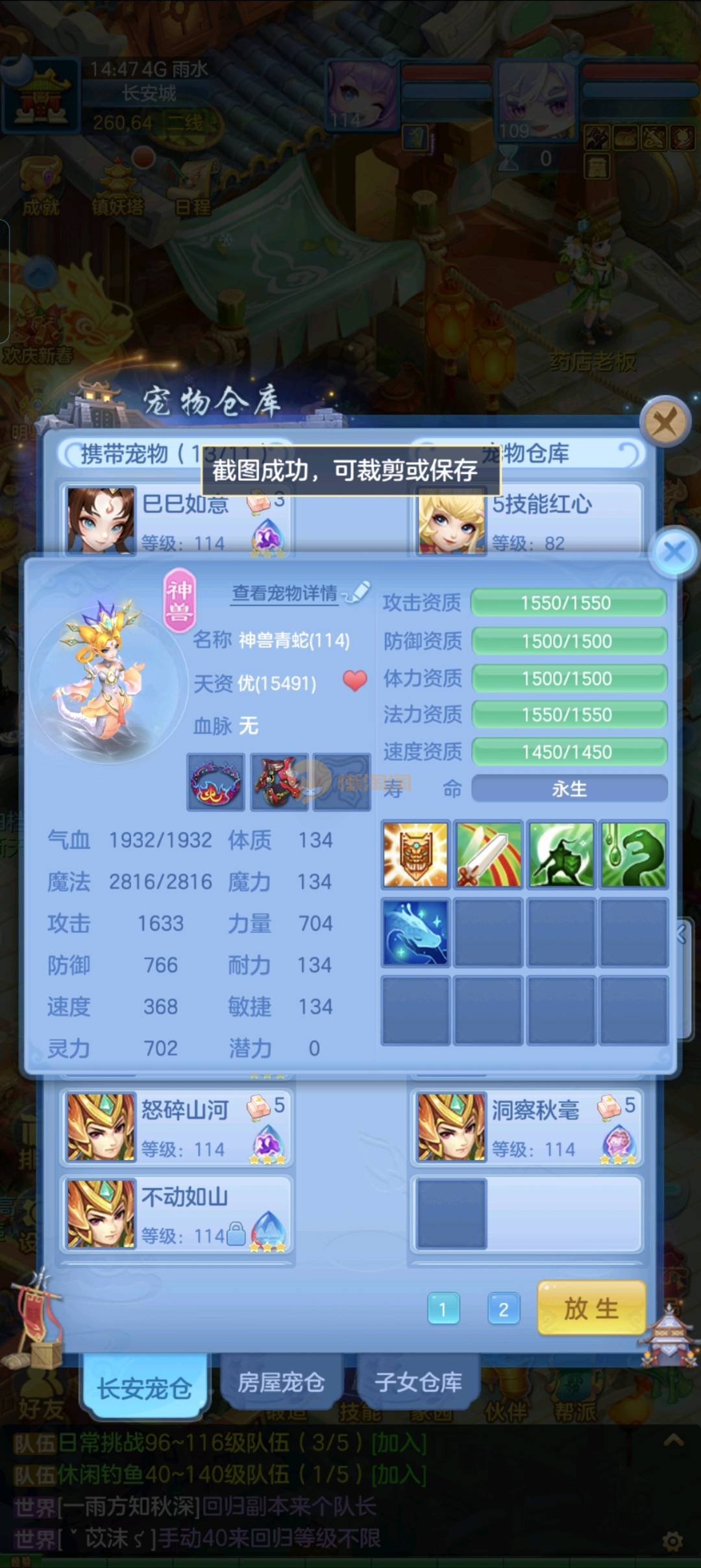 强化仙一龙两蛇一马。特技齐全,宝宝皮肤全,10个满兽魂,辅助特技妙手。13段混12,还有145万银,1884金,坐骑衣橱全,单身海景房,资源满满