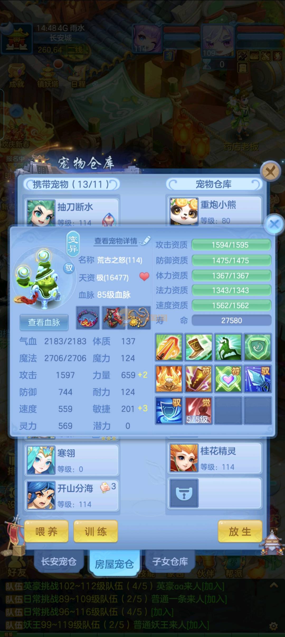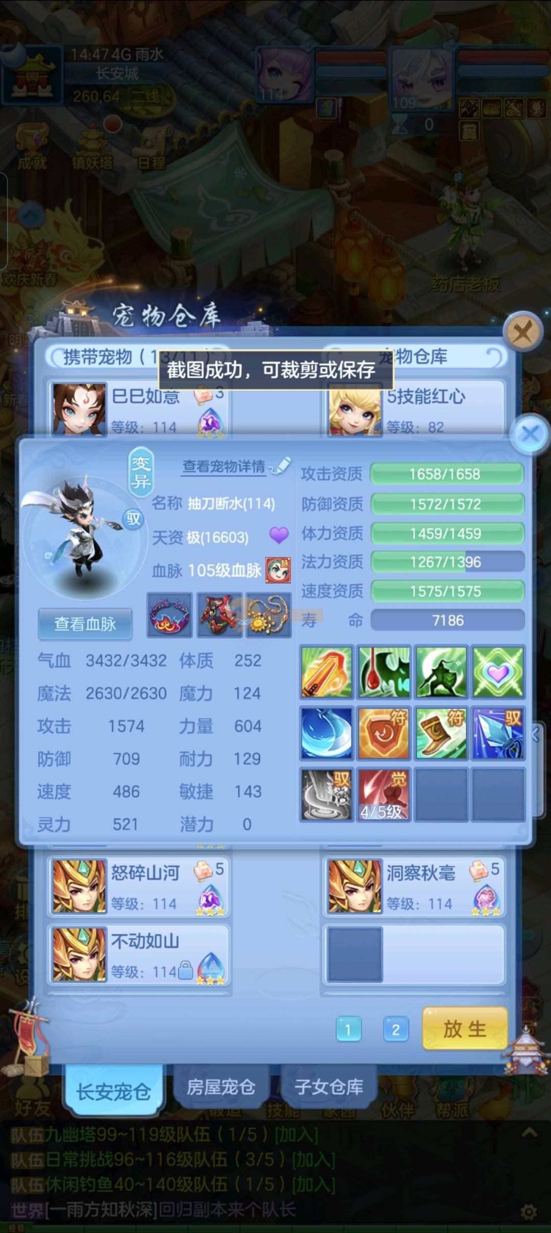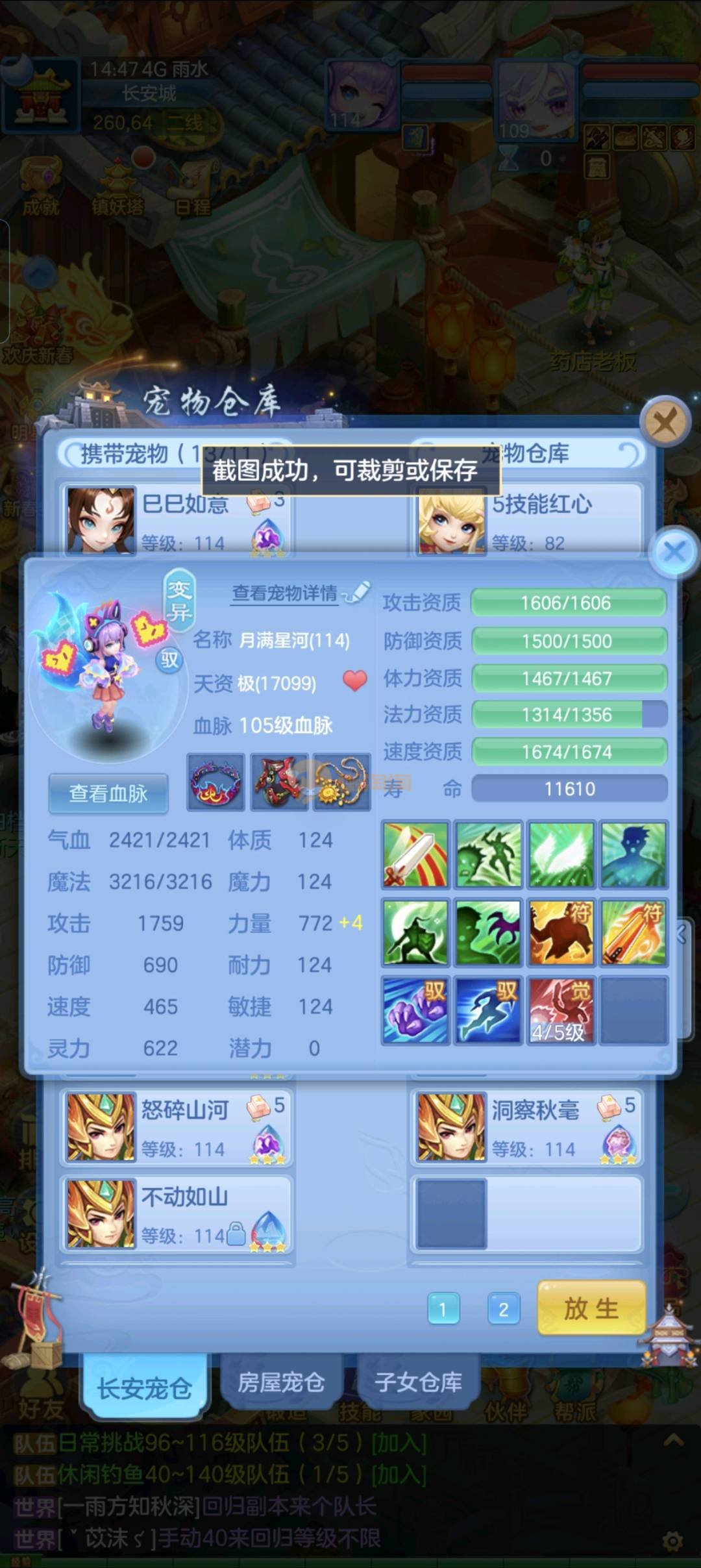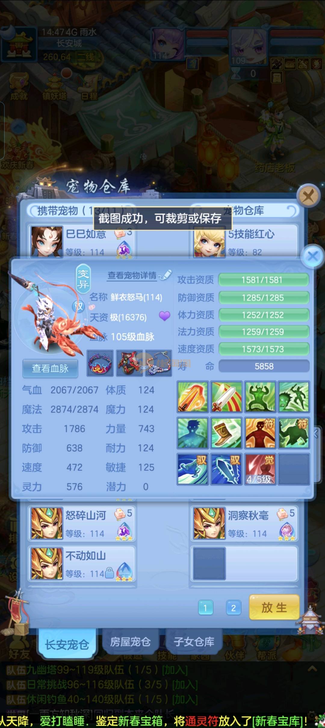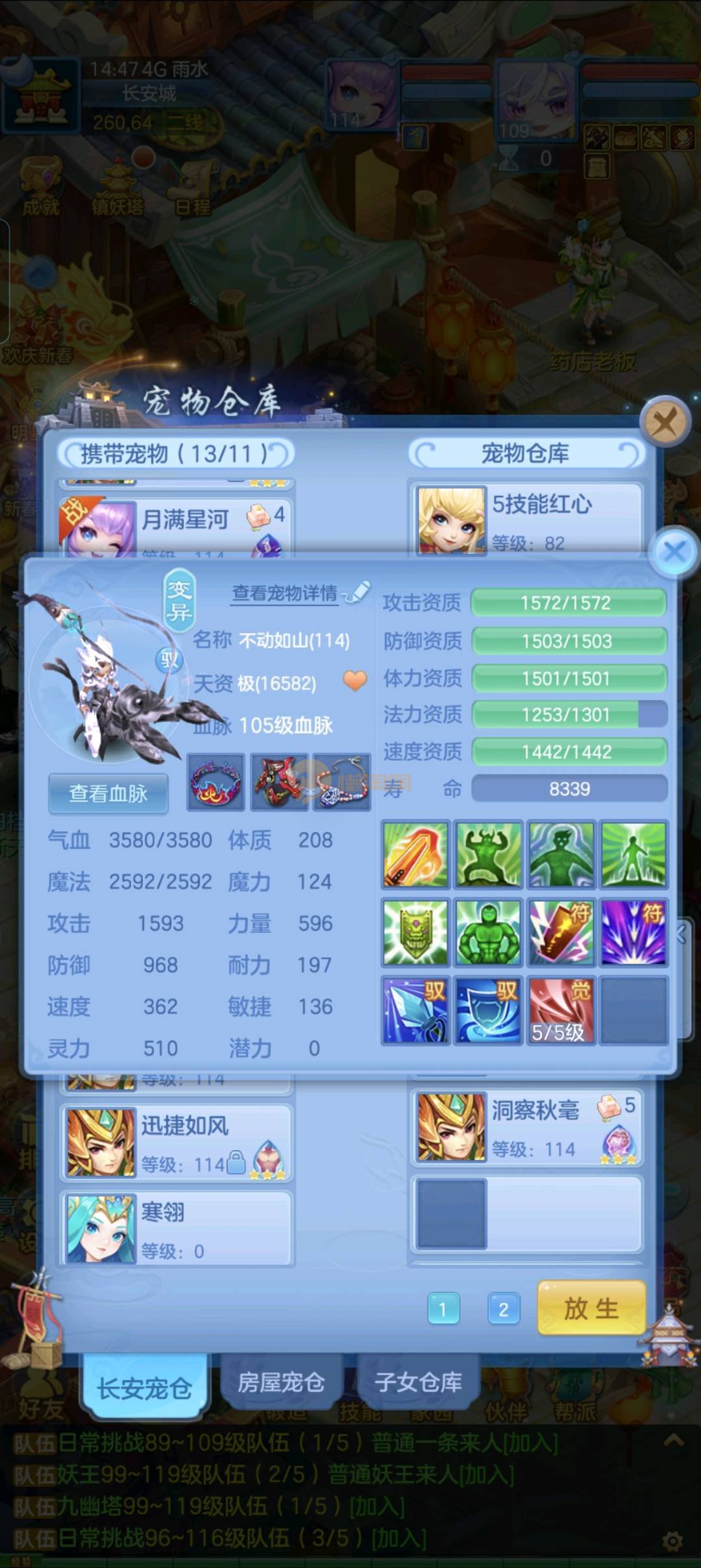 强化仙一龙两蛇一马。特技齐全,宝宝皮肤全,10个满兽魂,辅助特技妙手。13段混12,还有145万银,1884金,坐骑衣橱全,单身海景房,资源满满