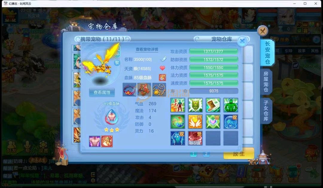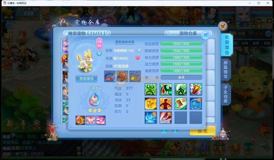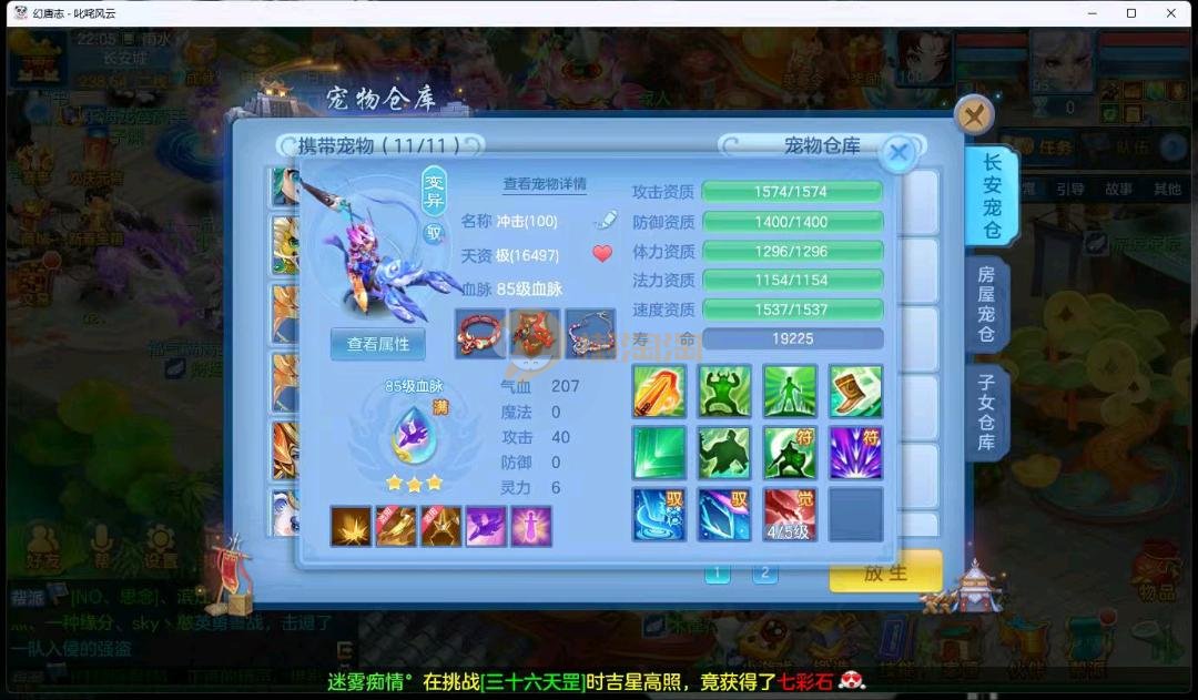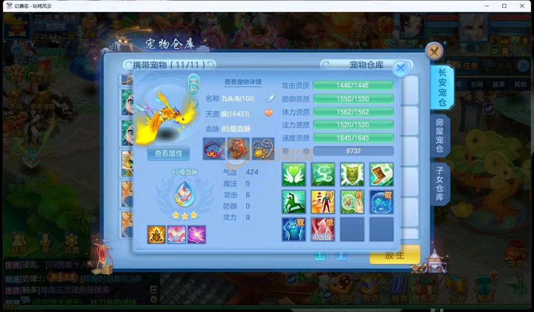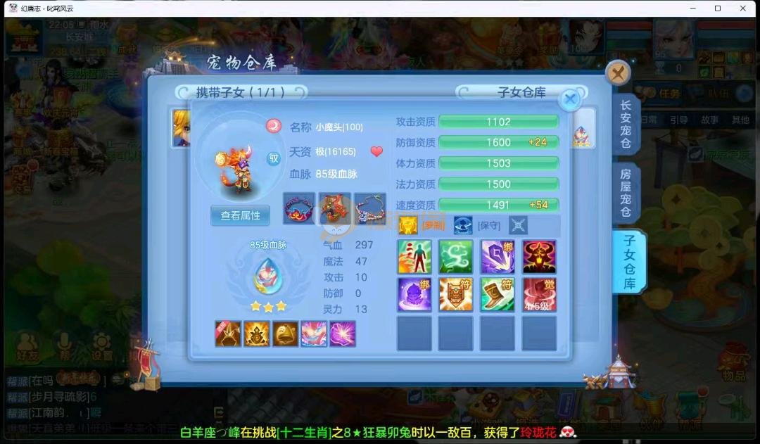 95级叱咤风云男万兽,3神兽,双蛇一个龙马,装备愤怒易躲避易,其他都是高属性易,装备很多宝宝很多,基本随便打细节看图