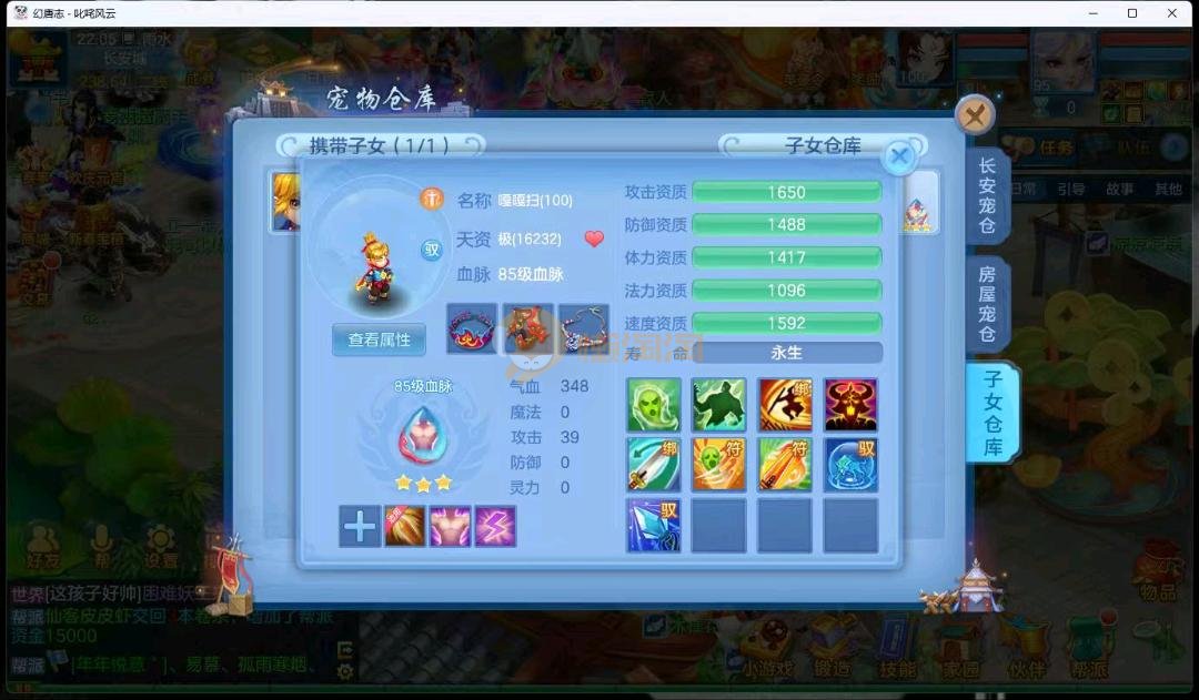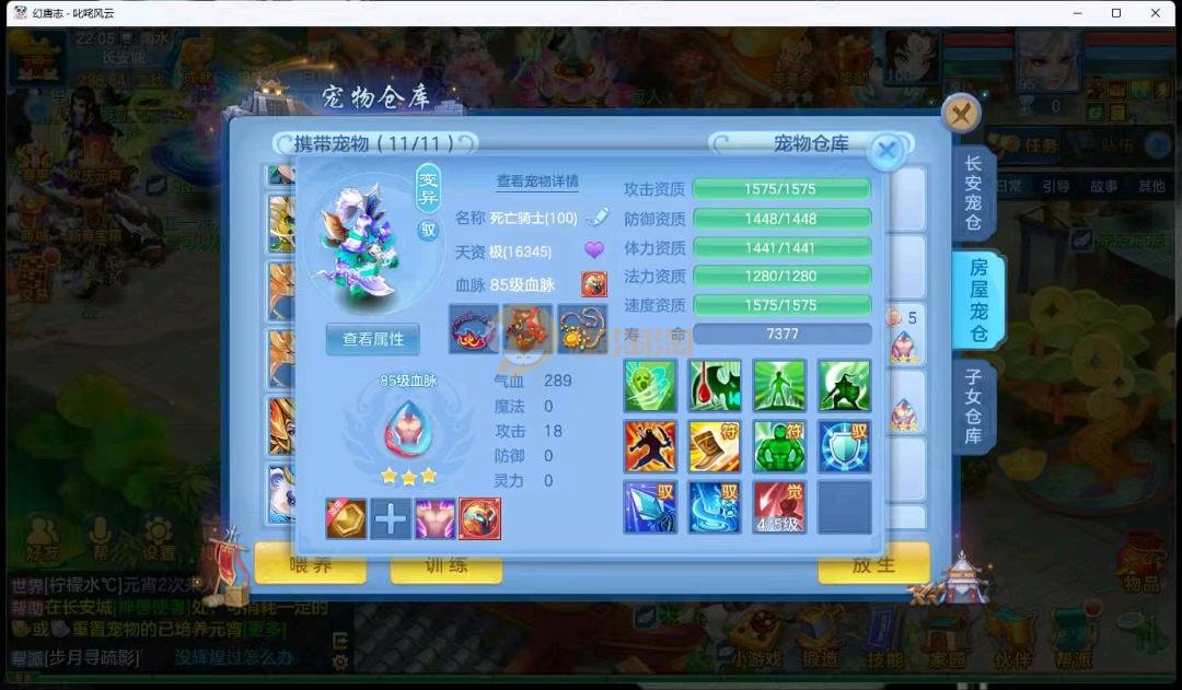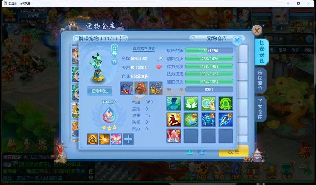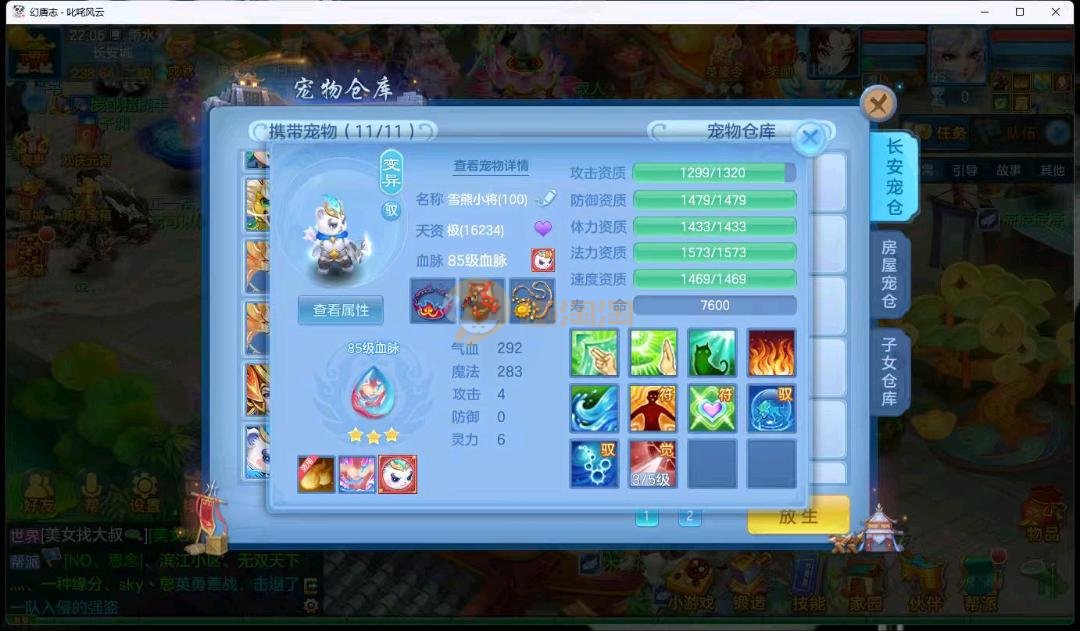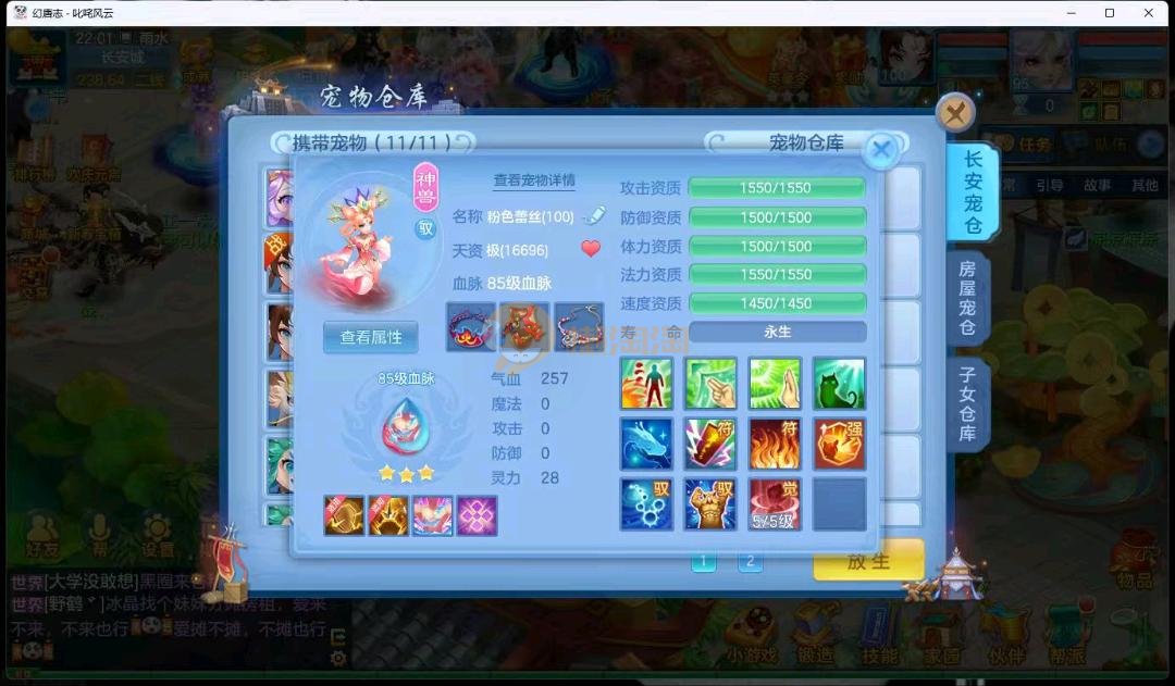 95级叱咤风云男万兽,3神兽,双蛇一个龙马,装备愤怒易躲避易,其他都是高属性易,装备很多宝宝很多,基本随便打细节看图