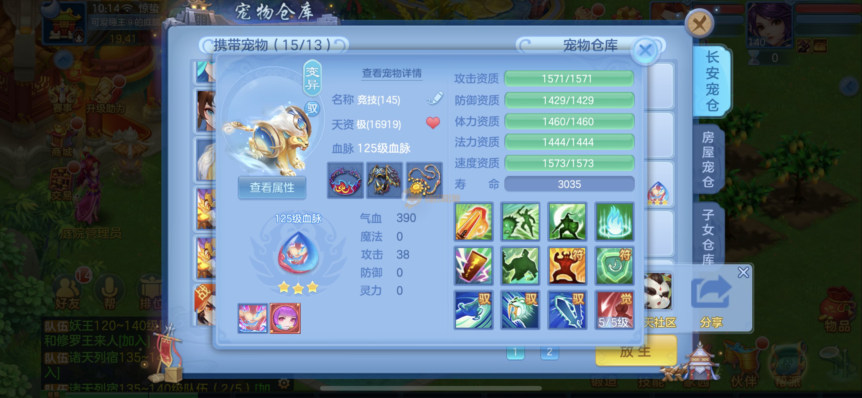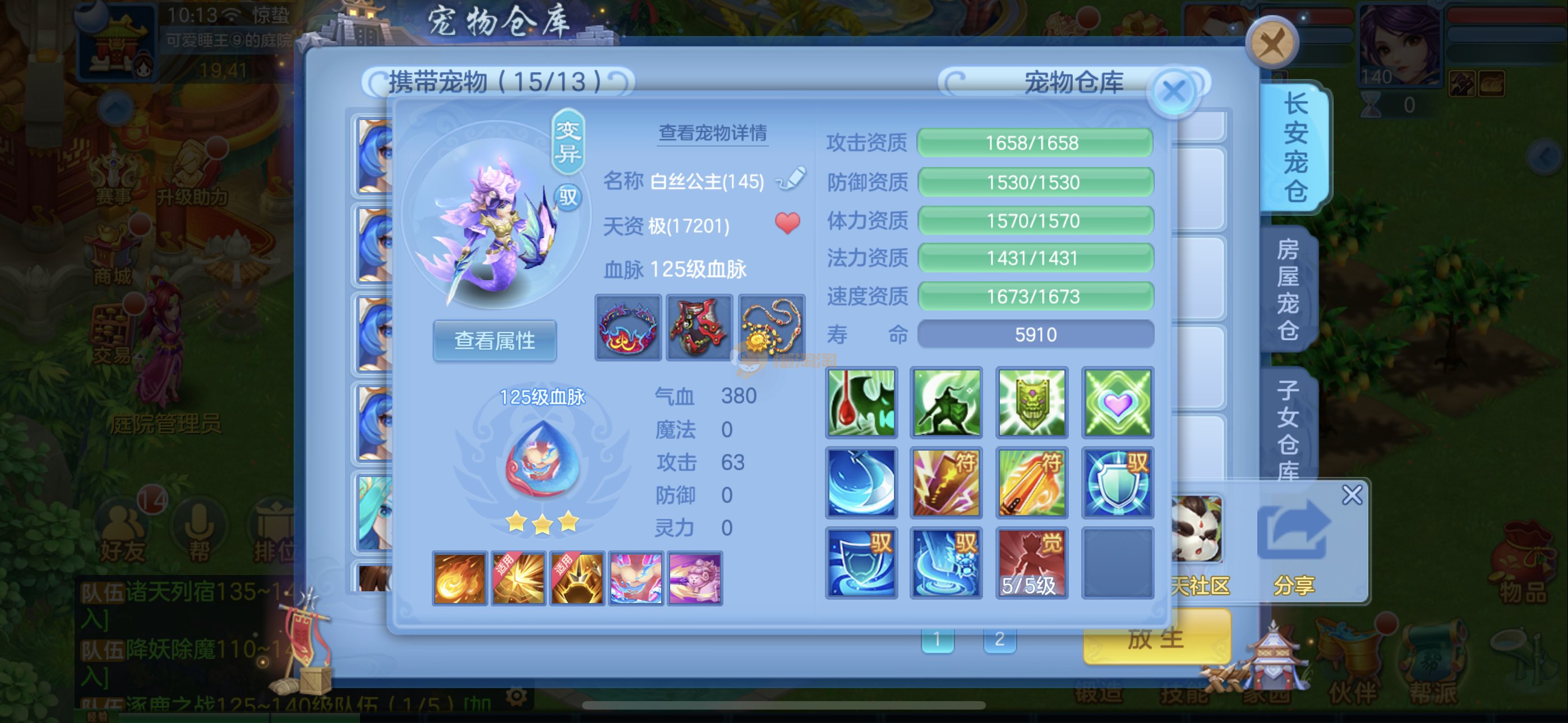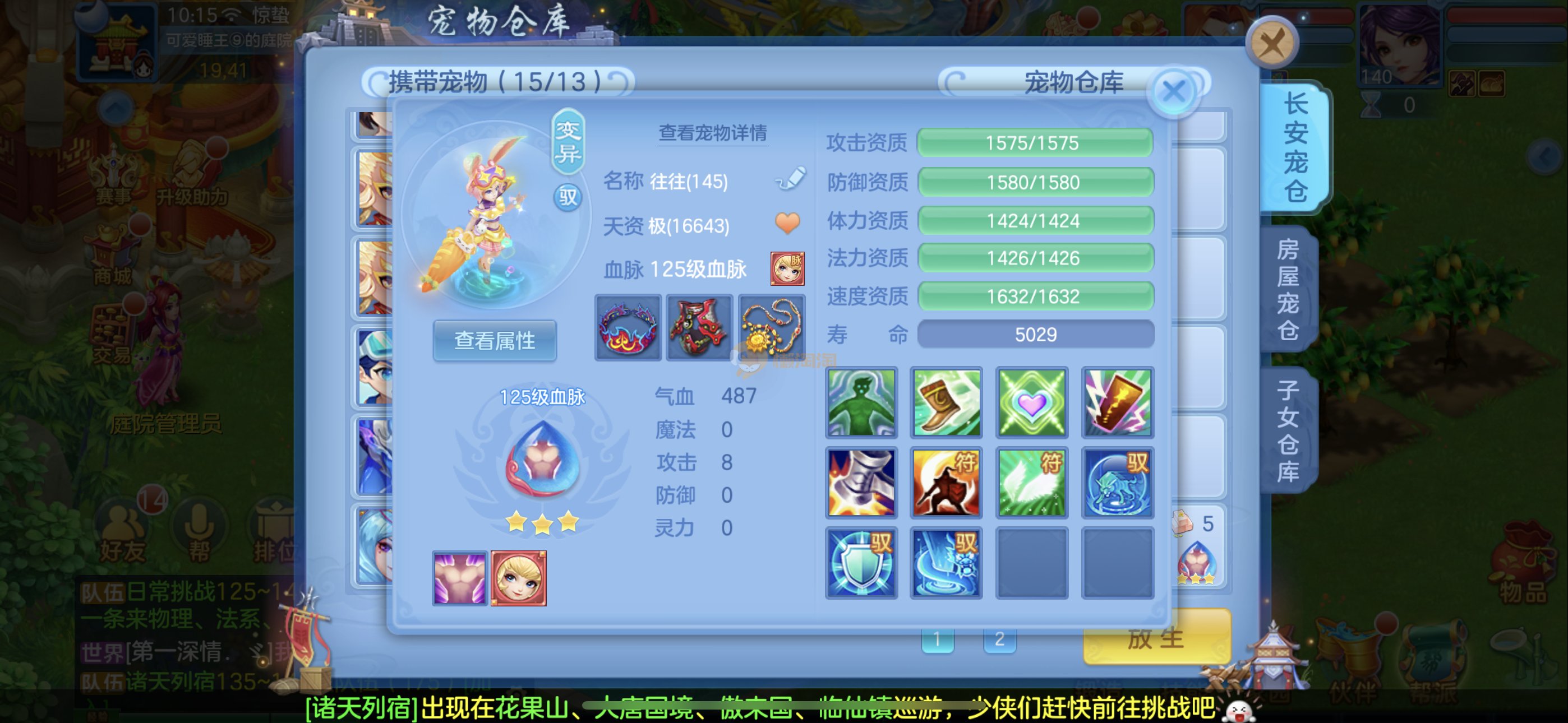 捡漏140冥月,霸王龙,4极品公主(仓库还有只),兔子,蚩尤,石头人,葫芦,云萝,祸斗,炎弓,虎大将,建木,玉斧,剑灵,噬魂兽,孟婆,基本全是红紫心爆资质,很多带专属天赋。15宝宝格子还可以开头像,3套人物加点2套装备切换,霸王龙坐骑,12专属,3皮肤。13段混毕业装上段就行。