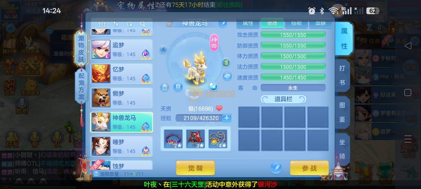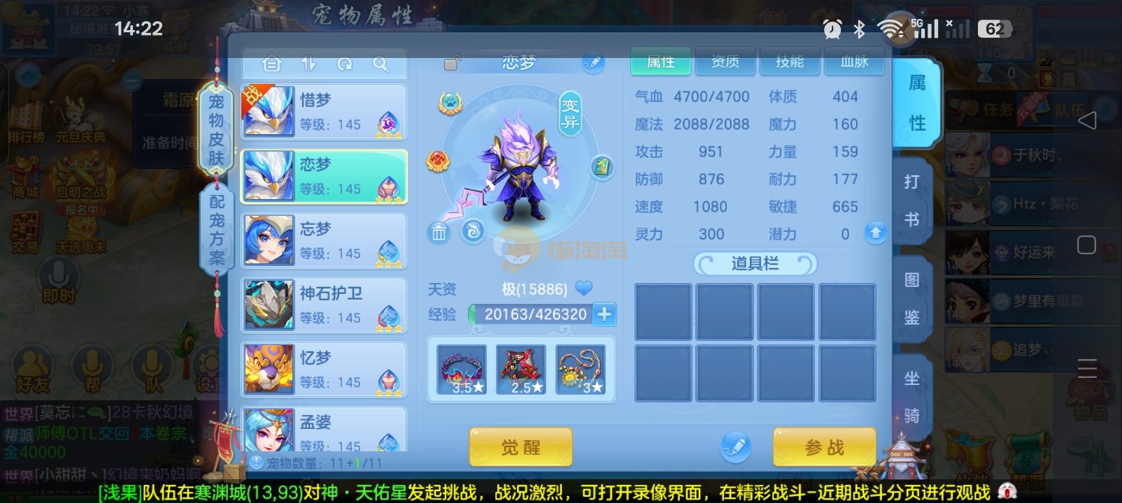 一线天宫,宝宝齐全,双神内胆一马一蛇,雷斯全服第四,涡逗1664法资,高坐骑,两套属性,身上760万银币,仓库500万,还童丹2万左右通灵13个高级通灵俩入手就能玩