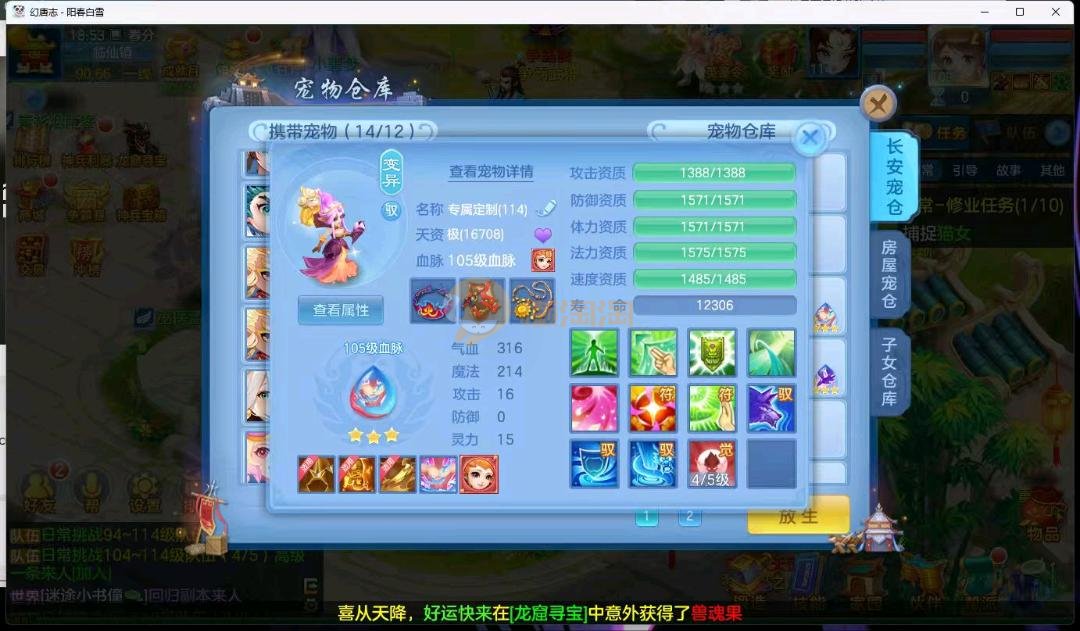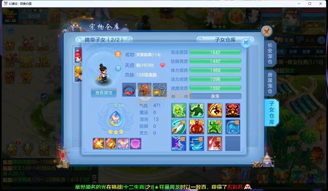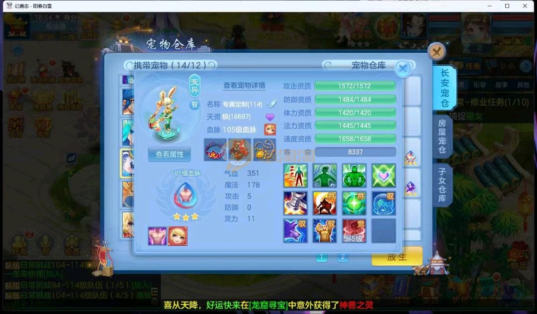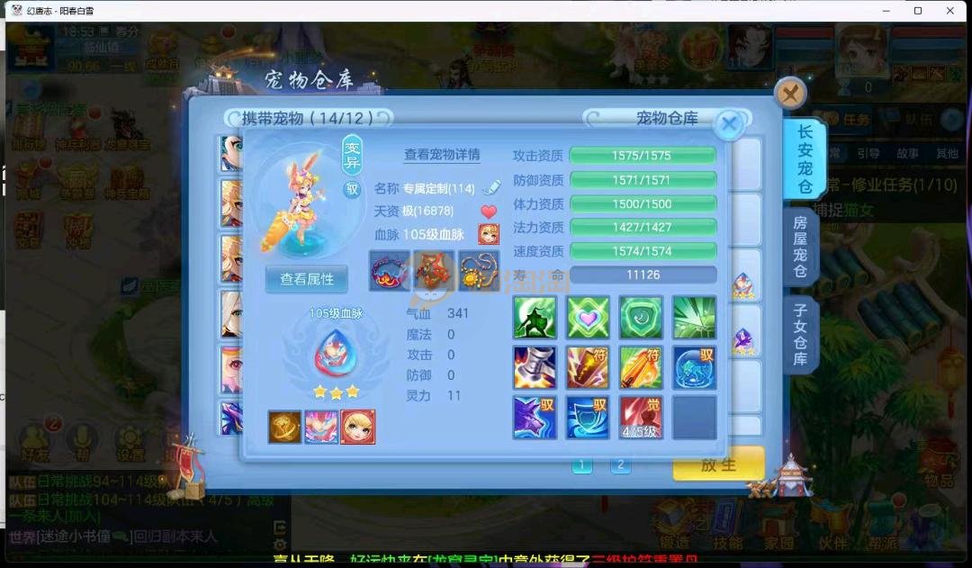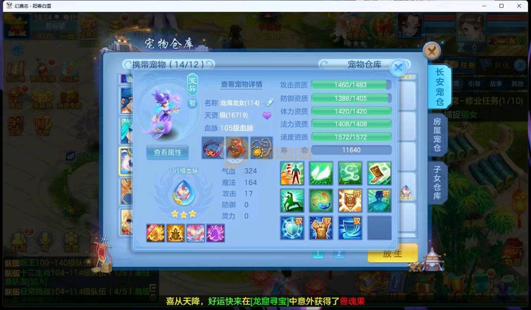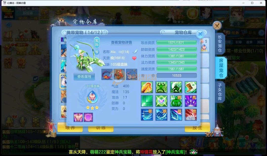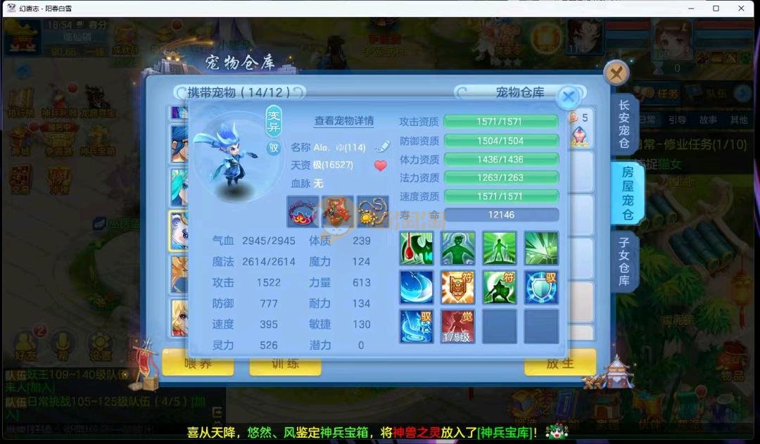 阳春白雪109级女万兽,天花板神器武器易狂暴591+37易狂暴,超级无敌武器养老无敌,细节看图3神兽,装备宝宝很齐全 细节看图