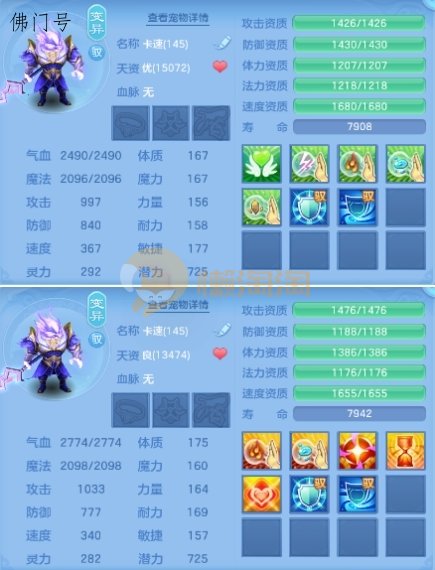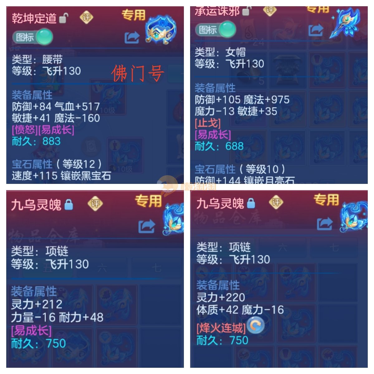 140天策加佛门双号。天策4件13锻,6件高属性易成长平均单加47.1。带1500万银子,宝宝20多个,仓库护符几车元宵,宝石物品多多。佛门10-12锻,愤怒易成长腰带,1.7万天资剑士,1.7万天资公主,480万银子。
