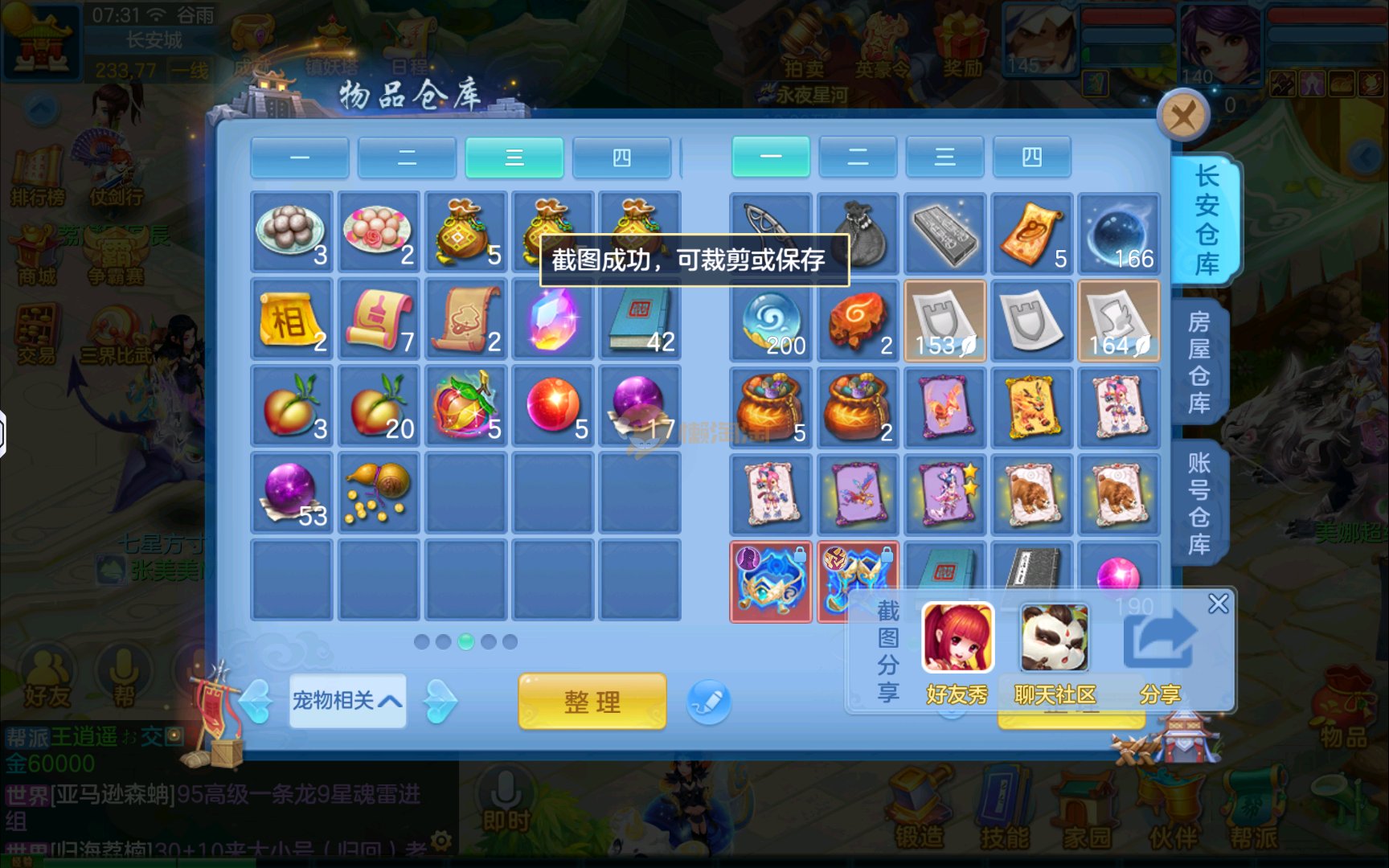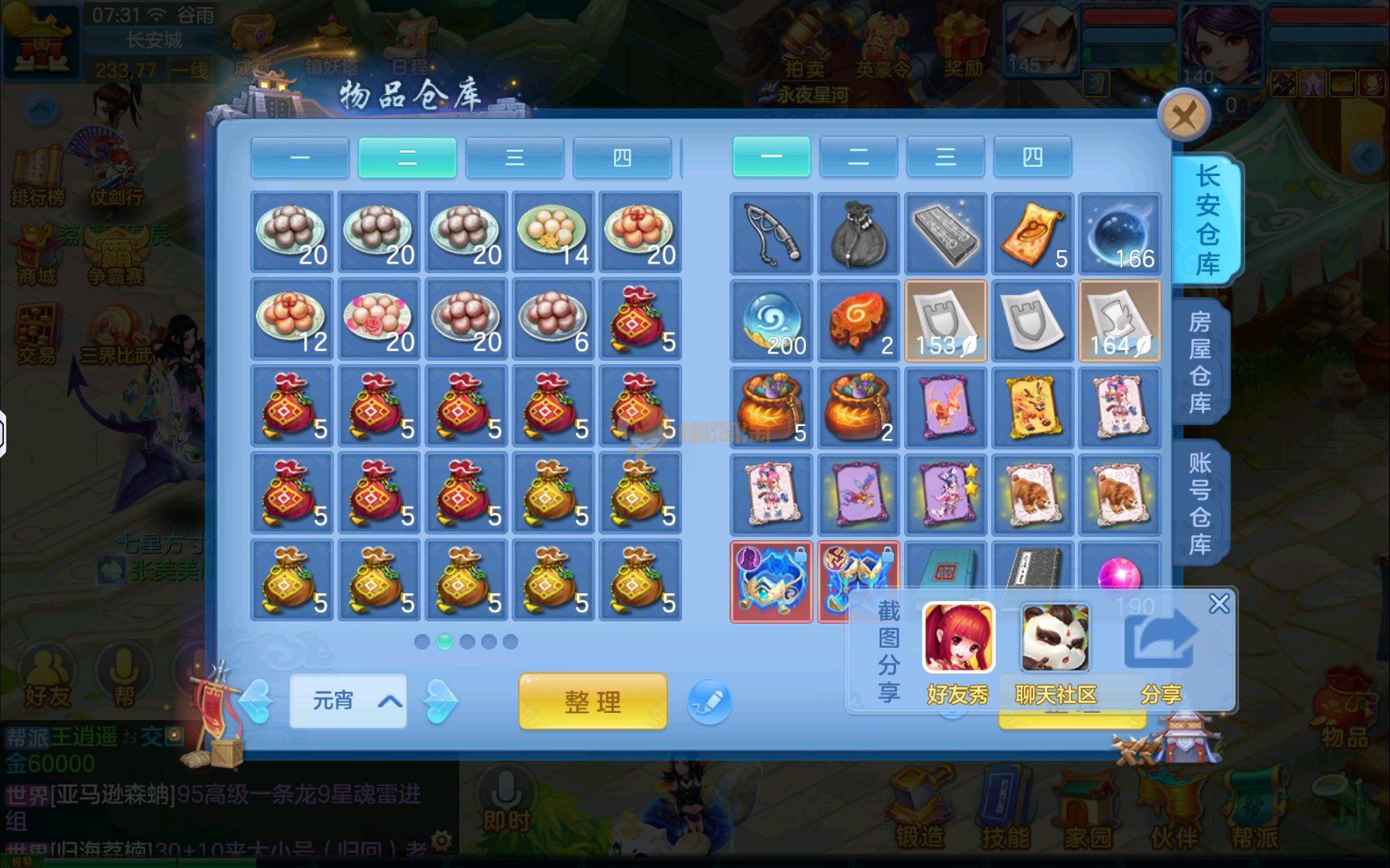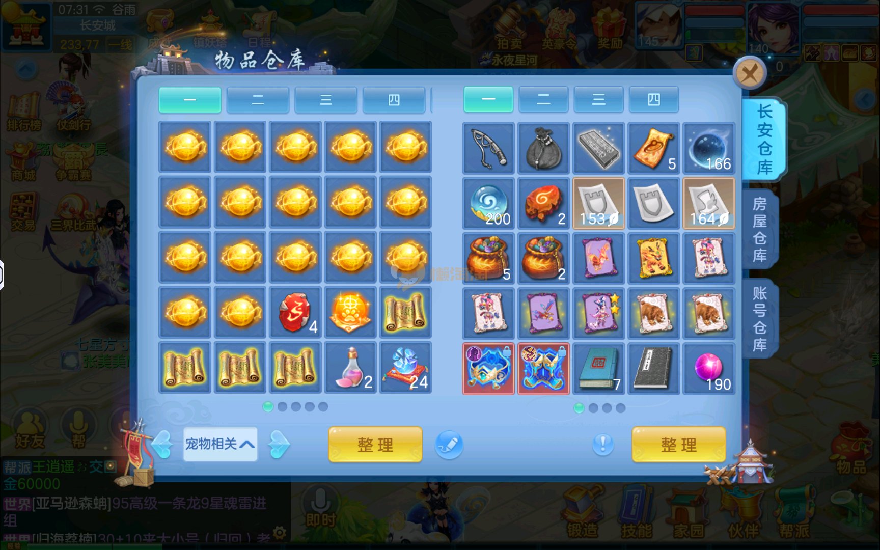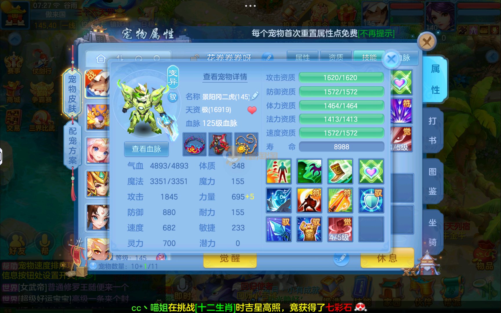 已有8个头饰7个背饰,11个专属有雷司,3个满配高级坐骑,5个满兽魂2个头像券70个神兽灵,有一个满资质内胆蛇。项链14段四星,衣服14段1星,备用装备很多有流星和狂风鞋可以转龙宫武侯,仓库有一堆资源可用,2980邮箱有双重
